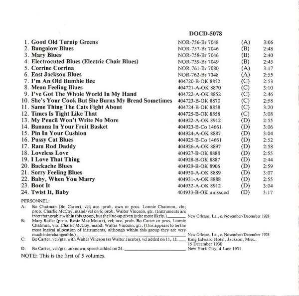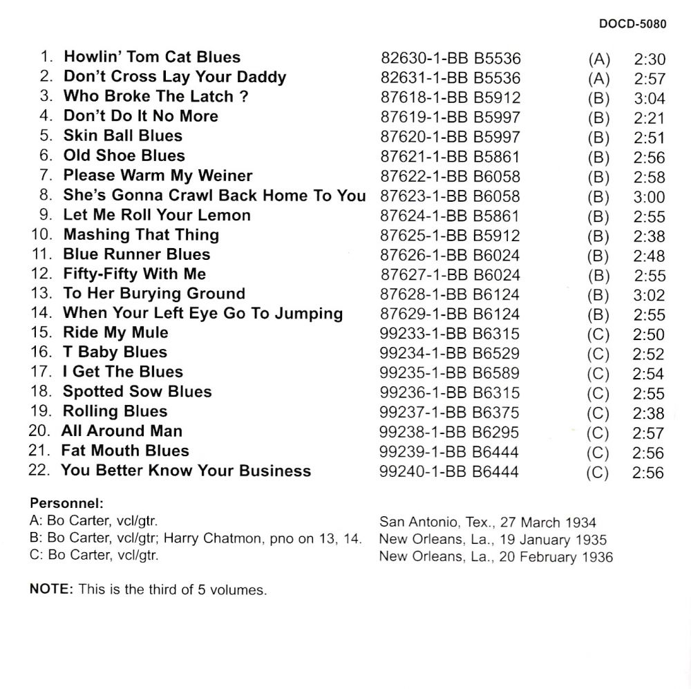 Bei seiner ersten Session unter dem Namen Bo Carter am 15. Dezember 1930 in Jackson/Mississippi profitierte der Gitarrist von zwei Jahren unterschiedlicher Aufnahmeerfahrung. Er teilte die Songs ordentlich in drei Kategorien ein. Die beiden mit den Fingern gezupften Blues-Nummern waren die herausragenden (“I'm An Old Bumble Bee“ und “Mean Feeling Blues“); wobei die nächsten beiden (“I've Got The Whole World In My Hands“ - eine Version von “Sifting On Top Of The World“ der Sheiks - und “She's Your Cook“) klingen wie die Hillbilly-Annäherungen an den Blues, die so oft vorkommen, bevorzugt von Bo und seinen Brüdern. Die letzten beiden Tracks an diesem Tag waren “Hokum-Blues“ in Anlehnung an die Popularität von Tampa Red, Georgia Tom, Big Bill und zahlreichen anderen, die auf der Welle der "Hokum-Mode" zu langen Karrieren ansetzten. Offensichtlich machte Bo Carter seine Hausaufgaben.