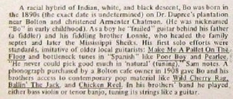 Bo Carter wurde Anfang der 1890 er Jahre (möglicherweise am 21. März 1893 oder Januar 1894) als Armenter (oder Armenta) Chatmon auf Doktor Duprees Plantage außerhalb von Bolton/Mississippi geboren. Sein Vater, Henderson Chatmon, lernte während der Sklaverei von einem Pflanzer das Geigenspiel und war bei den White Square Dances in der Gegend sehr gefragt. Seine Mutter, Eliza Jackson, spielte Gitarre. Da beide Eltern aufgrund der Popularität ihres Vaters bei den örtlichen Tänzen zu musikalischen Aktivitäten neigten und ein fertiges Publikum hatten, ist es nicht verwunderlich, dass mehrere der Chatmon-Kinder eine Streichorchester gründeten. Unter der Leitung von Bruder Lonnie (* 1888) wurde diese Familienband zur Basis für die Mississippi Sheiks, die in den frühen Depressionsjahren der meistverkaufte Race-Recording-Act waren. Die Scheichs bestanden normalerweise aus den Brüdern Lonnie, Bo oder Sam und Walter Vincson, die alle mehrere Instrumente spielten. Aber die Sheiks waren nicht die einzige Kombination aus Chatmons und anderen lokalen Musikern, die Aufnahmen machten oder auftraten. Vielmehr gab es sowohl innerhalb der Familie als auch unter ihren zahlreichen Bekannten einen Pool von Talenten, aus dem Musiker für Anlässe jeder Größe und Stilrichtung geschöpft werden konnten.