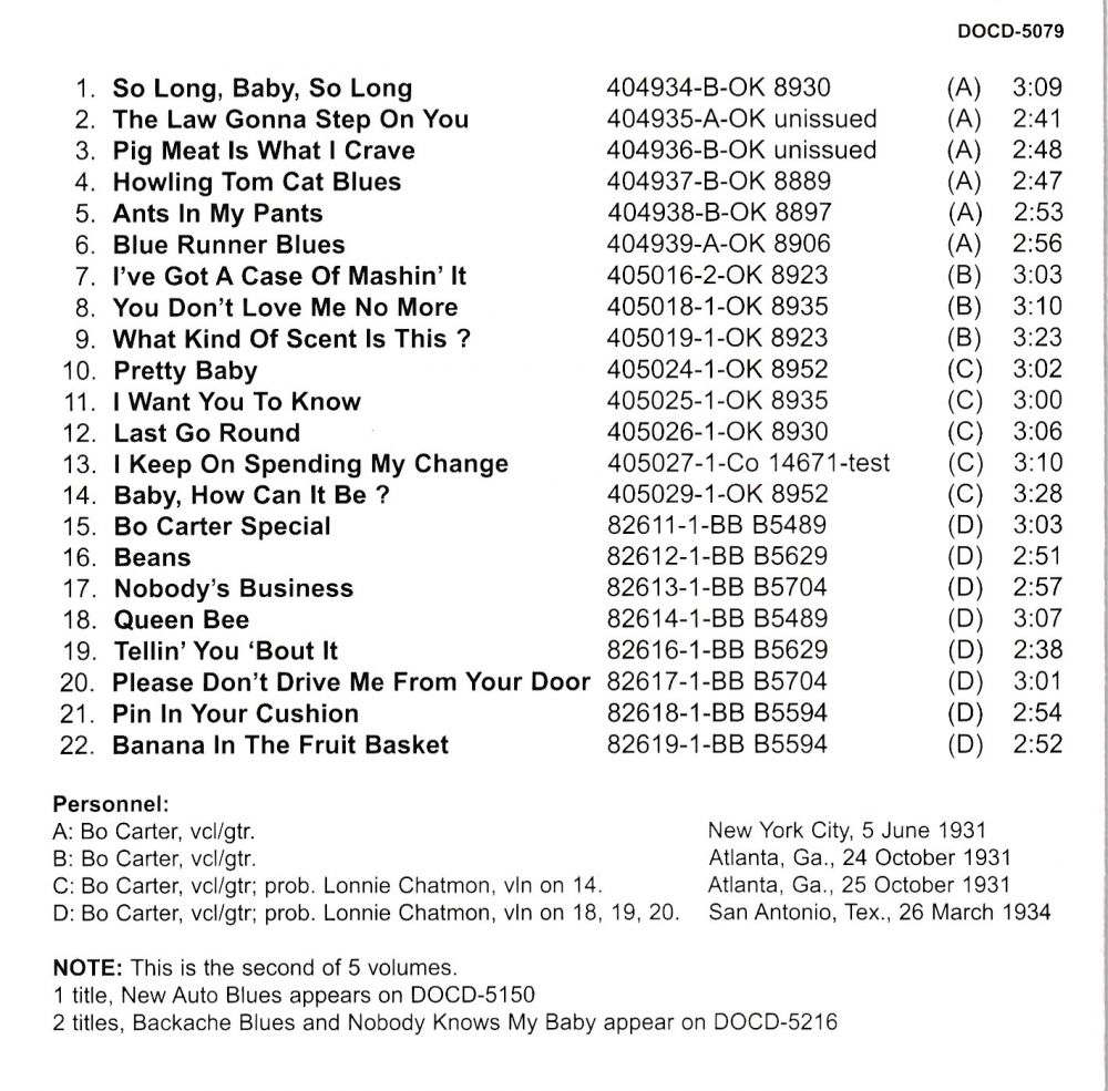 Die Ergebnisse dieser Aufnahmeausbildung waren bereits in der Session am 15. Dezember 1930 offensichtlich, aber zum Zeitpunkt der Tracks vom 04. Juni 1931 (siehe Band 1) und denen des folgenden Tages war Carter in der Lage, 18 Titel herauszubringen , von denen damals 15 von Okeh und Columbia herausgegeben wurden. Er begann die zweitägige Session mit drei Hokum-Blues, die auf der Gitarre mit einem Plektrum gespielt wurden (zumindest deutet der Stil des Zupfens darauf hin, selbst wenn er tatsächlich mit Daumen oder Fingern zupfte). Nach zwei finger picked blues songs (“Pussy Cat Blues“ und “Ram Rod Daddy“ - siehe Vol. 1) kehrte er mit einem zurück mit mehr Blues im Plektrum-Stil, bevor er die Session an diesem Tag und die Session am 05. Juni vollständig mit Fingerpicking-Nummern beendet. Somit waren mehr als drei Viertel der aufgenommenen Nummern Fingerpicked Blues oder Songs mit starkem Blues-Einfluss. Glücklicherweise sind die drei ursprünglich unveröffentlichten Titel von Okeh als Testpressungen erhalten geblieben. Alle drei sind mindestens so gut wie alle veröffentlichten Tracks, was einen dazu veranlasst, sich zu fragen, warum Okeh sie nie verwendet hat. “Twist It, Baby“ (siehe Band 1) scheint Carters Version von Caldwell Braceys “Stered Gal“ (“Stir It Gal“) zu sein. Bracey war im Dezember 1930 bei der Sitzung in Jackson/Mississippi anwesend, und Carter hörte das Lied wahrscheinlich zu dieser Zeit. Tatsächlich waren mehrere im Juni 1931 von Carter aufgenommene Songs Remakes bekannter Songs oder Versuche, einen populären Stil neu zu verpacken. “Loveless Love“ ist eine Version des oft aufgenommenen Standards “Careless Love“, und “Baby, When You Marry“ (beide auf Vol. 1) war, obwohl Fingerpicking, eine überzeugende Imitation der Blues-Jodler von Hillbilly-Star Jimmie Rodgers. “So Long, Baby, So Long“ war eine Interpretation von Leroy Carrs Hit “How Long-How Long Blues“, während “Ants In My Pants“ die Melodie des Sheiks-Hits “Sitting On Top Of The World“ verwendete. “Blue Runner Blues“ schließlich war eine Überarbeitung von Blind Lemon Jeffersons “Black Snake Moan“.