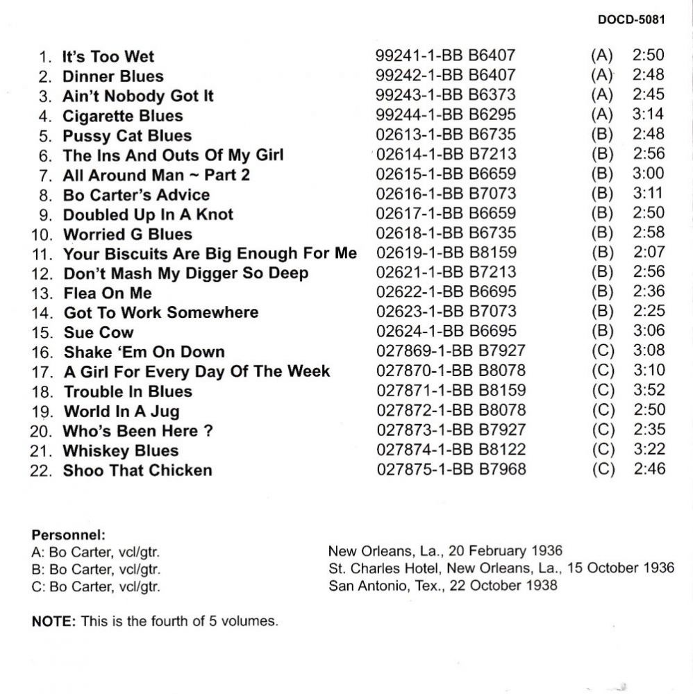 Die Frage, ob Carters Texte "pornografisch" oder lediglich eine hemmungslose und sogar gesunde Sicht auf Sexualität sind, ist wirklich relativ, und der Leser wird auf Steve Calts Essay auf der Rückseite von Yazoo LP L-I064 verwiesen, um einige Einblicke in diese Besonderheit zu erhalten. In Bo Carter - Vol. 1 sind sicherlich genug "rohe" Daten enthalten. 4 damit der Zuhörer zu seinem eigenen Schluss kommt. “All Around Man“, “It's Too Wet“, “Cigarette Blues“, “Your Biscuits Are Big Enough For Me“ und “Don't Mash My Digger So Deep“ sind Klassiker ihrer Art und die hinreißende Gitarrenarbeit auf “Cigarette Blues“ allein sollte ausreichen, um selbst den Gelegenheitshörer davon zu überzeugen, dass hier mehr als suggestives Wortspiel steckt.