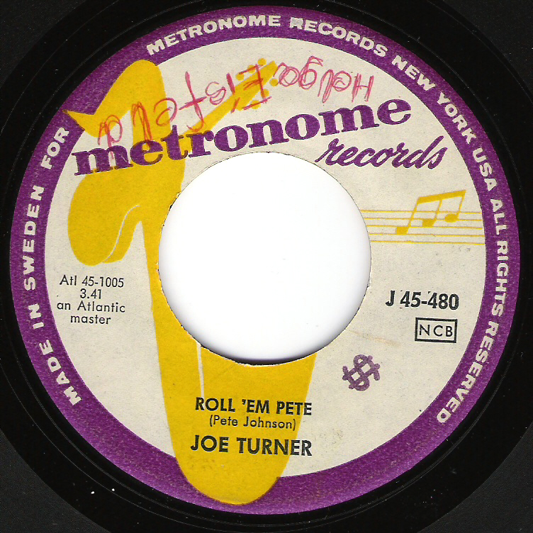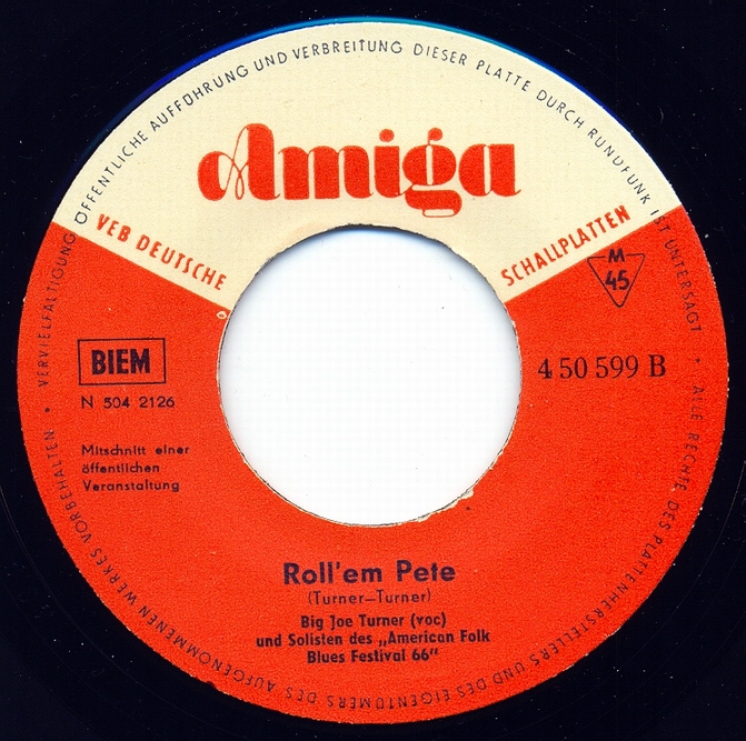 Roll' em Pete hat Joe Turner noch viele Male in seiner Karriere aufgenommen. Es folgen zwei Beispiele aus meiner Sammlung: eine Metronome EP (MEP 269, 1956, schwedische Pressung, Atlantic Master) und eine Live-Single aus der damaligen DDR (AMIGA 450599, 1966). Letztere wurde bei einem Konzert des "American Folk & Blues Festivals '66" mitgeschnitten. Auch die andere Plattenseite läßt sich hören: Junior Wells mit dem Vietnam-Blues.