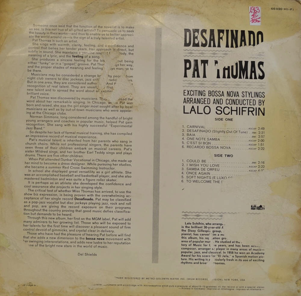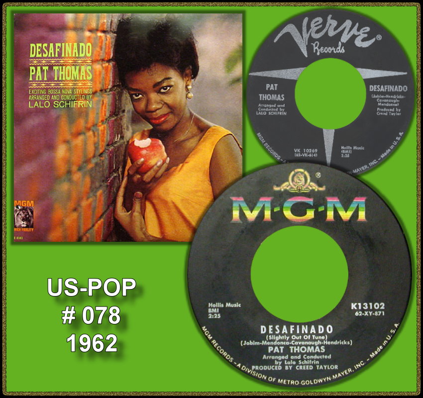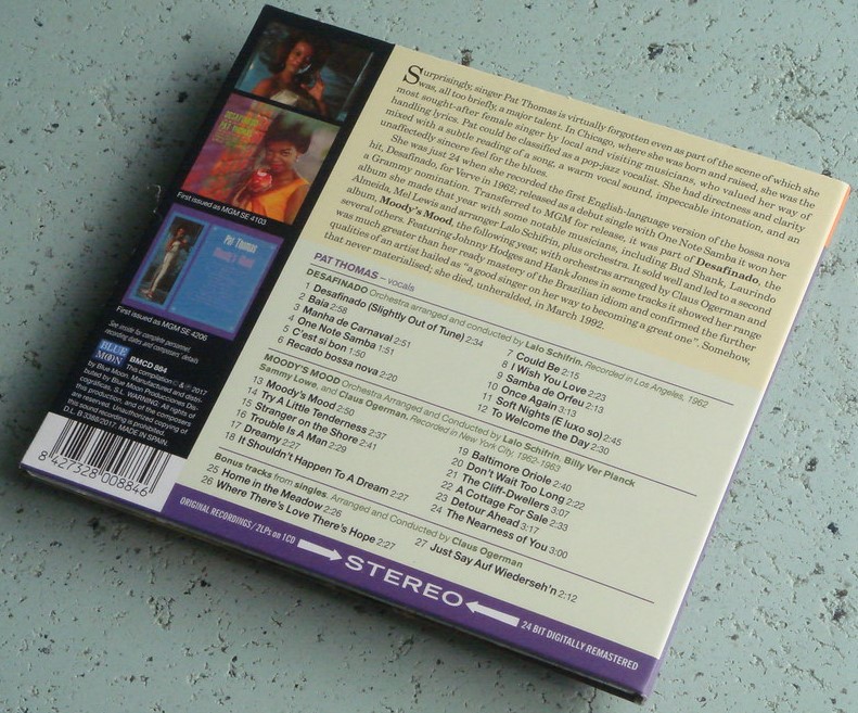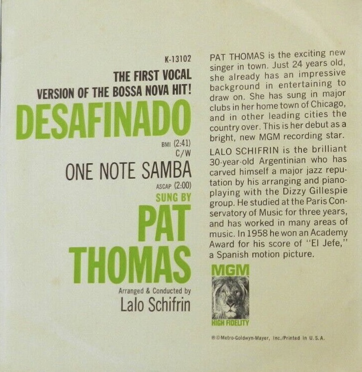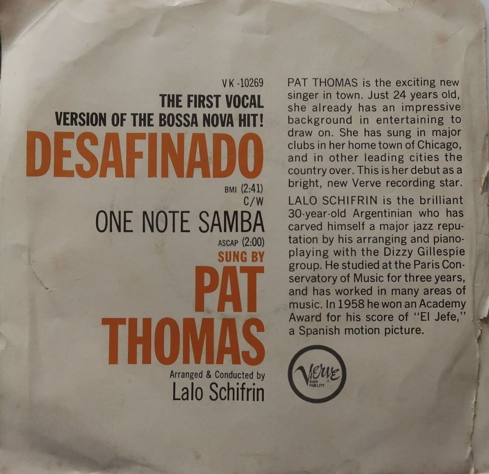 Pat Thomas (31 July 1938 – 24 March 1992) was an American jazz singer from Chicago who had a hit with "Desafinado". Surprisingly she is virtually forgotten even as part of the scene of which she was, all too briefly, a major talent.