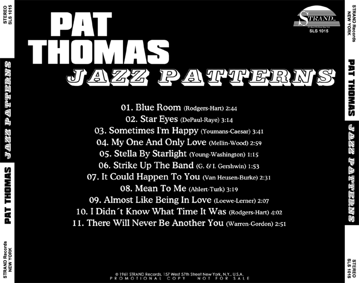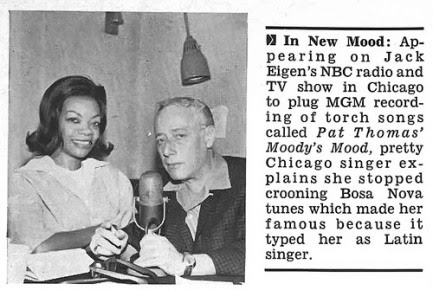 Born in Chicago 31 July 1938, her real name was Patricia Thomas. The seventh of eight children, her talent is inherited from her parents, both of whom sang in church choirs. Pat’s sister Mildred was a singer, and her brother Earl Teddy played drums with Dakota Staton and Carmen McRae. Pat attended Dunbar Vocational in Chicago where she had decided to become a dress designer. She summered as a Red Cross swimming instructor, and her athletic ability spread to baseball and basketball as well. But dress designing and sports have gone a-glimmering. Pat’s a singer.