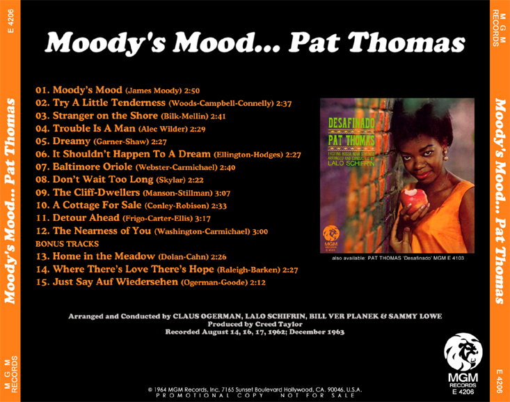 It sold well and led to a second album, Moody’s Mood, in 1963, with orchestras arranged by Claus Ogerman and several others. Featuring Johnny Hodges and Hank Jones in some tracks it showed her range was much greater than her ready mastery of the Brazilian idiom and confirmed the further qualities of an artist hailed as “a good singer on her way to becoming a great one”.