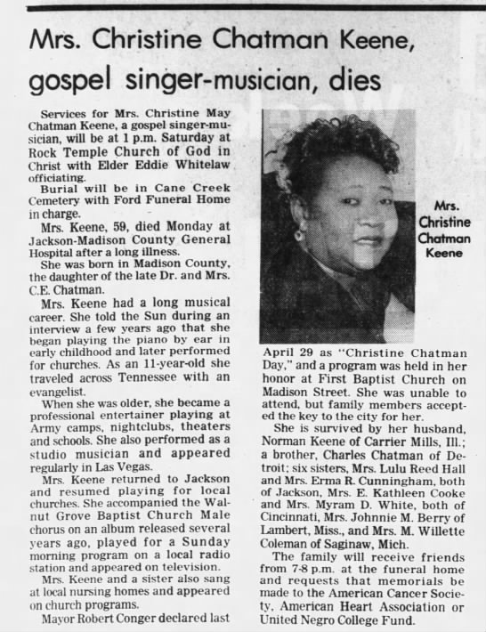 Christine Chatman, eine aus Indiana stammenden Pianistin und Sängerin. Sie spielte auch Akkordeon, ein Instrument, das, soweit wir wissen, auf keiner ihrer Aufnahmen auftaucht.