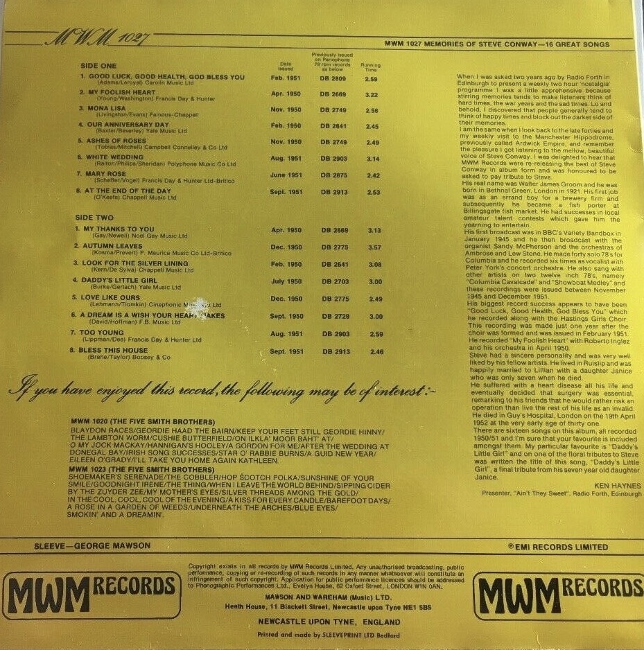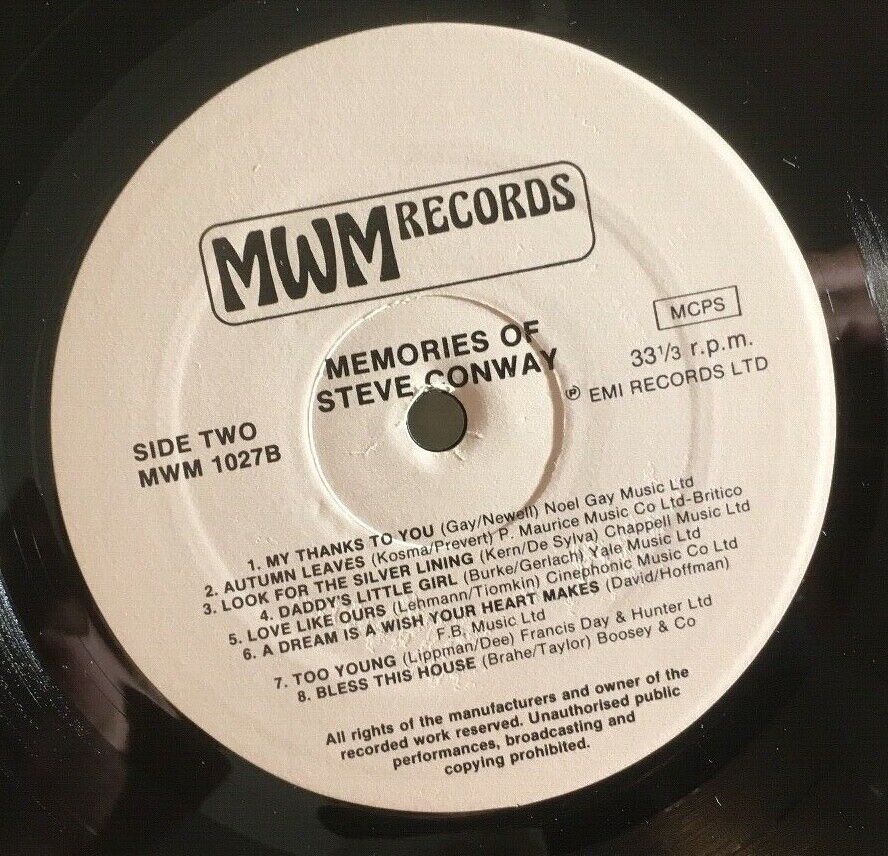 Andere bekannte Songs, die Conway aufgenommen hat, waren “Bless This House“ und “Look For The Silver Lining“. Im Studio wurde er von Roberto Inglez, Peter Yorke, Jack Byfield, Arthur Young, Jackie Brown und Philip Green begleitet. Conway wurde nicht nur von Yorke unterstützt, sondern war auch der Sänger auf mehreren Aufnahmen, die unter Yorkes Namen veröffentlicht wurden. Conways letzte Aufnahmen wurden am 06. Oktober 1951 in Begleitung von Ray Martin und seinem Orchester gemacht. Herausgegeben im Dezember 1951, waren dies “With All My Heart and Soul" und “Chez Moi", letzterer Titel mit Musik, die von Paul Misraki komponiert wurde.