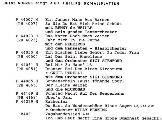 ab 1946 Polydor-"Gib’ Mir ’nen Kuß"-1946, "Halli-Hallo, Wir Spielen Toto"-1949, 48181 "O Donna Juanita"-1949 (& DORLE RATH), "Samba-Express"-1950 o. "Opapa"-1950 u. "Senor Caballero"-1950 u. "Alles Für Die Firma"-1950 (& FRIEDEL HENSCH und die CYPRYS), "Die Kleine Fischerhütte Von Lugano" (& GRETL PERELLI), "Mein Schatz, Du Kannst Nicht Richtig Küssen", "Ich Weiß Am Bodensee Ein Kleines Strand-Café" (& EVA SANTO), "Anneliese", Philips-"Ein Kleiner Junge Aus Barmen",