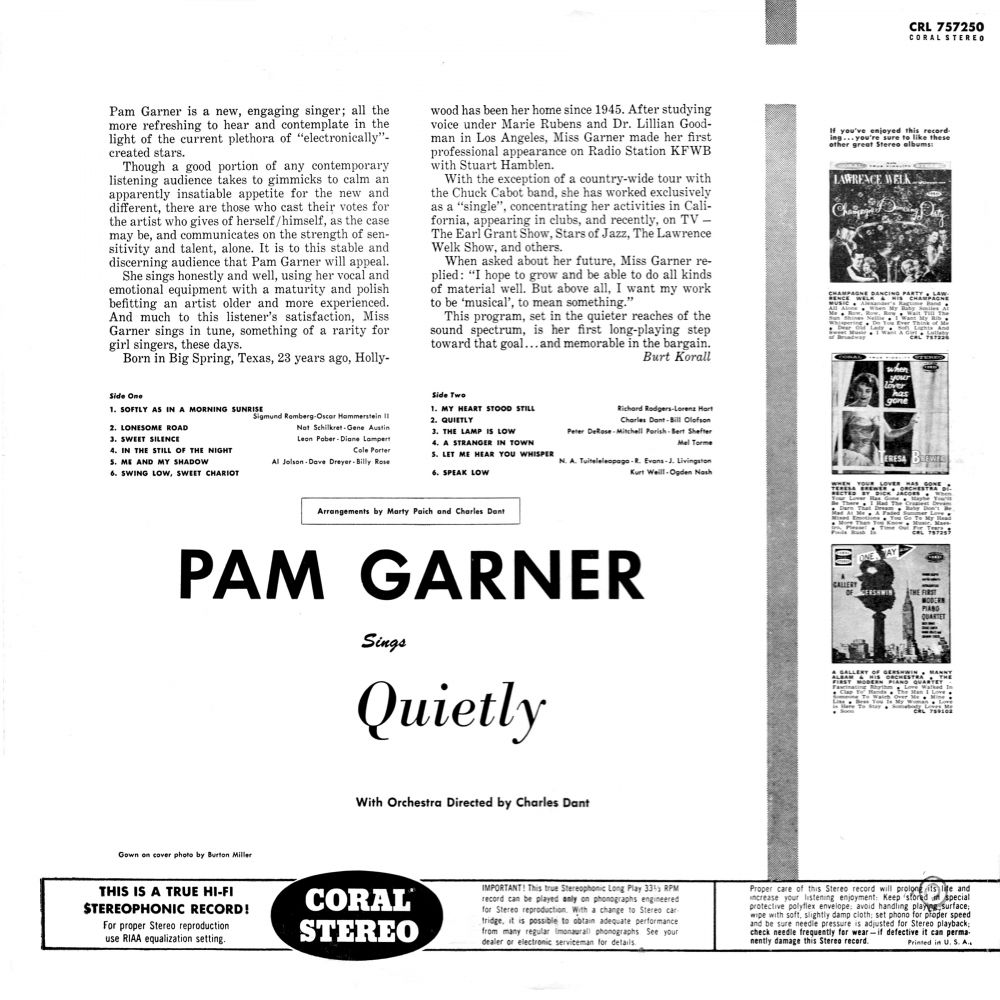 Laut Liner Notes wurde Pam Garner um 1937 in Big Spring, Texas, geboren, doch seit 1943, als sie acht Jahre alt war, war Hollywood ihre Heimat. Nach ihrem Gesangsstudium bei Marie Rubens und Dr. Lillian Goodman in Los Angeles begann sie ihre kalifornische Karriere tagsüber bei einer Hypothekenbank und hatte ihren ersten professionellen Auftritt als Country- und Westernsängerin beim lokalen Radiosender KFWB mit Stuart Hamblen.