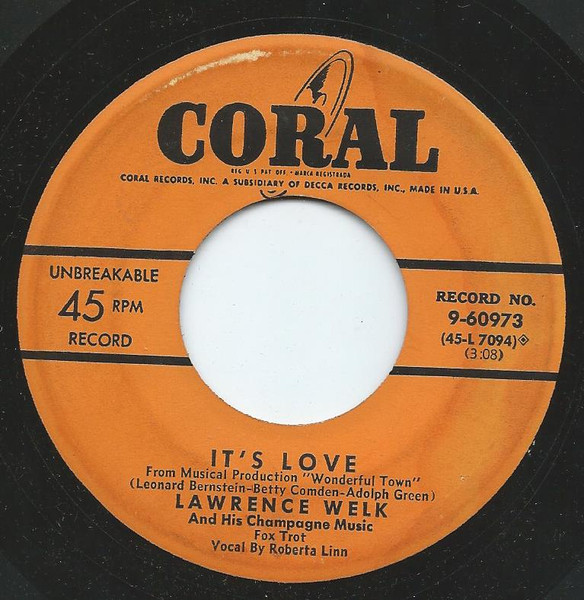 04 53....9-60973....LAWRENCE WELK And His Champagne Music Vocal By Roberta Linn..It's Love (45-L 7094)/LAWRENCE WELK And His Champagne Music Vocal By The Sparklers..Ohio (45-L 7095)