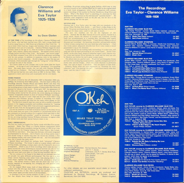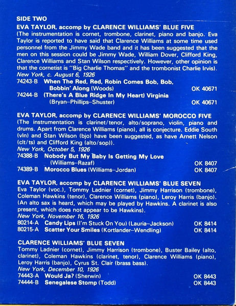Im Gegensatz zur Anfangsphase von Eva Taylors Karriere, die eine einigermaßen anhaltende Aufnahmetätigkeit zu gewährleisten schien, waren die Jahre 1923 bis 1927 eher sporadisch. Wie bereits erwähnt, schien Taylors Studioarbeit von der Verfügbarkeit ihres Ehemanns Clarence Williams abhängig zu sein, der für ihre Sessions Band- und/oder Klavierbegleitung bereitstellte. Ein Blick auf Williams' Arbeitsplan zeigt, dass Blues-Sängerinnen wie Rosetta Crawford, Dora Carr, Irene Scruggs, Billy & Mary Mack, Katherine Henderson (siehe DOCD 5375-5376), zusammen mit Künstlern wie Butterbeans & Susie, Esther Bigeou, Virginia Liston, Lawrence Lomax, George MacClennons Jazz Devils und den Jamaica Jazzers (um nur einige zu nennen), zunehmend seine Zeit in Anspruch nahmen, was die Aufnahmekarriere seiner Frau Eva beeinträchtigte.