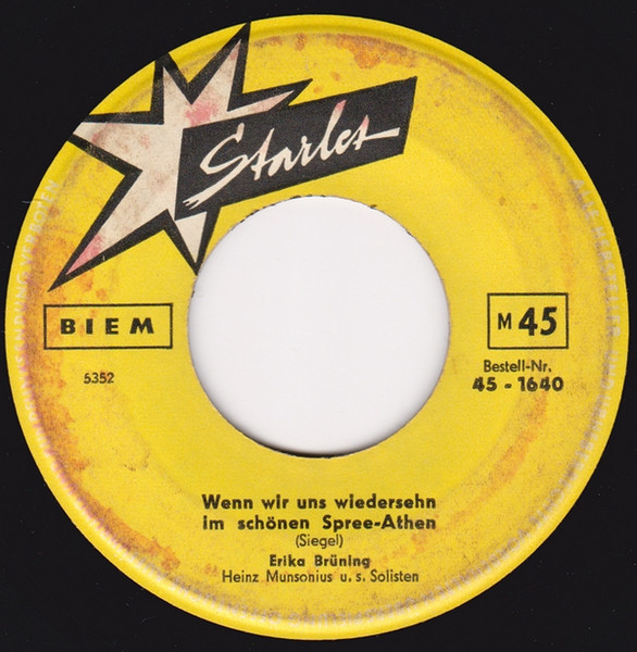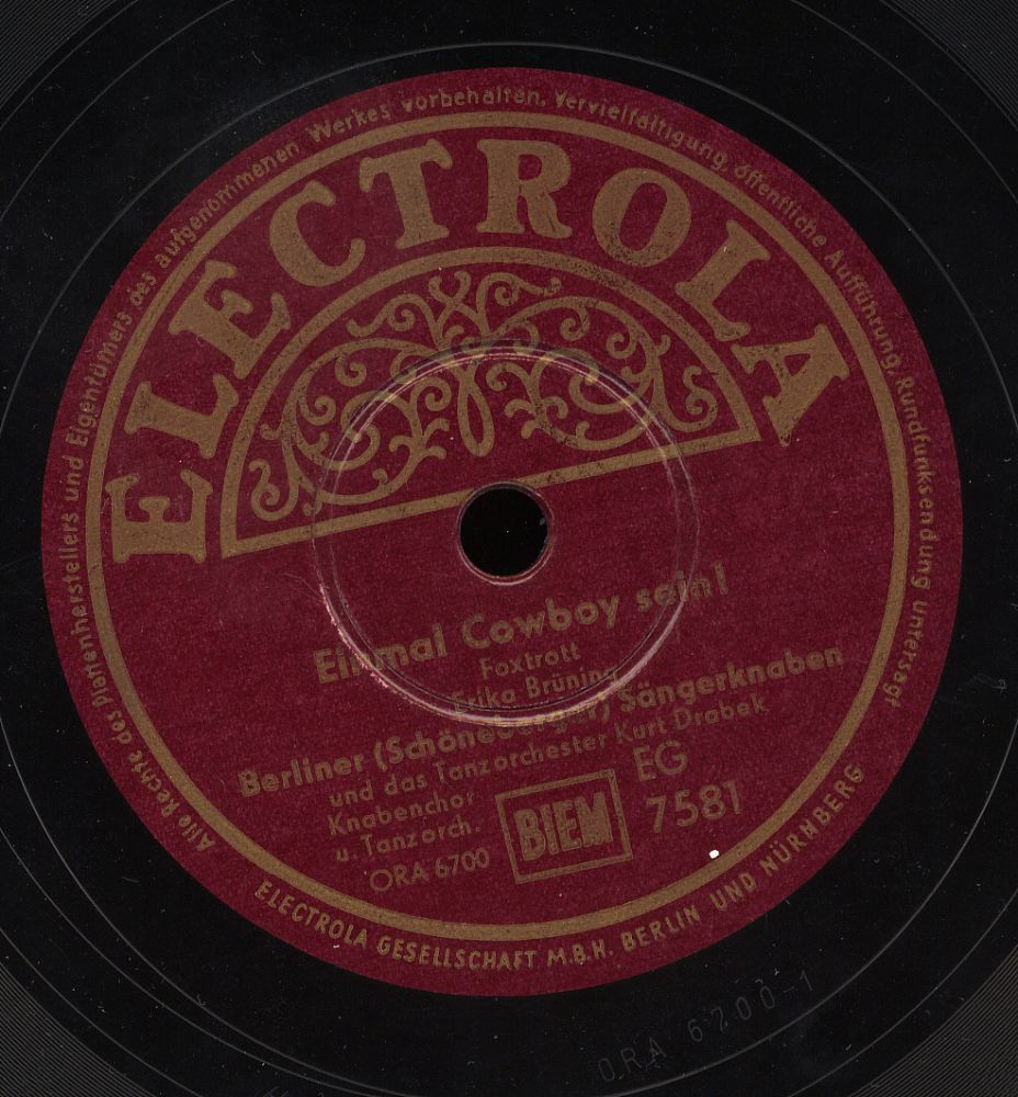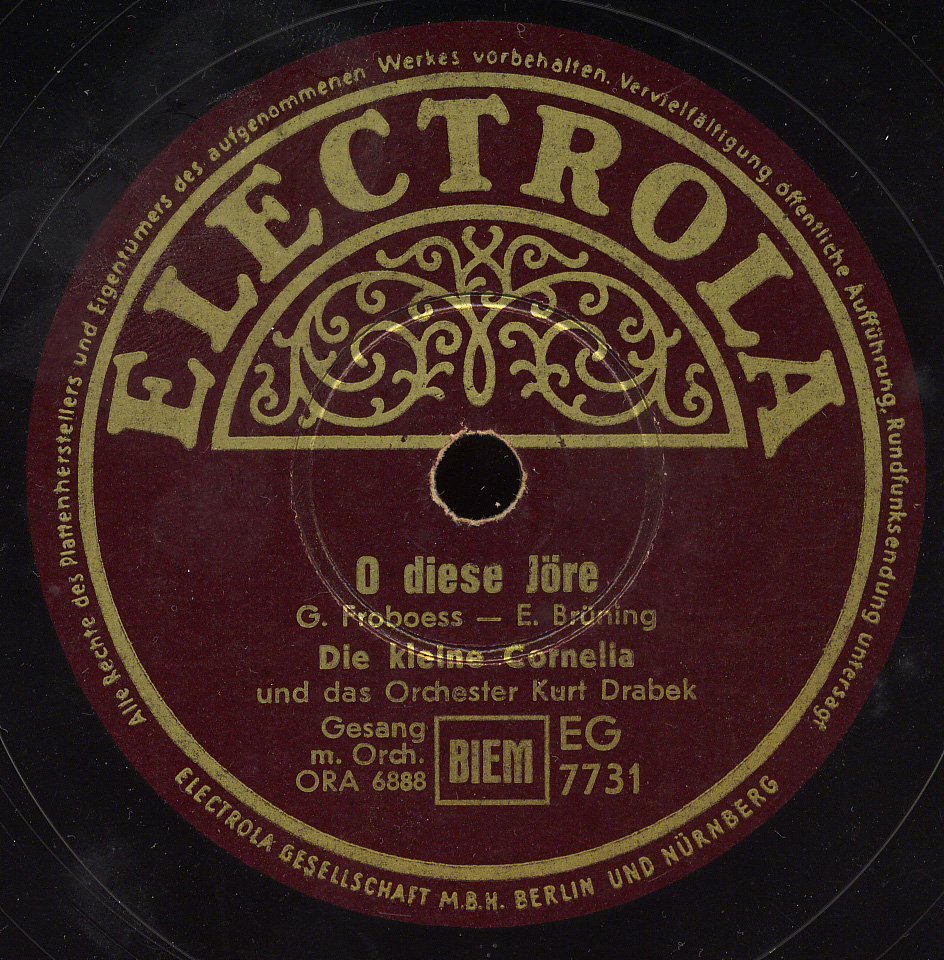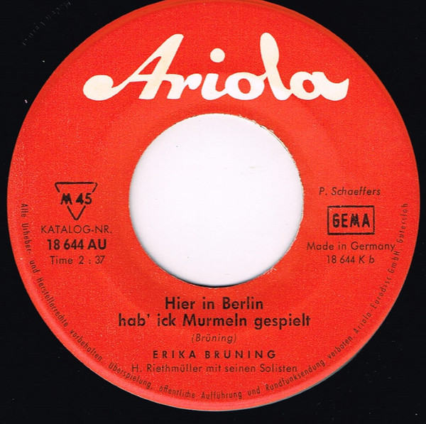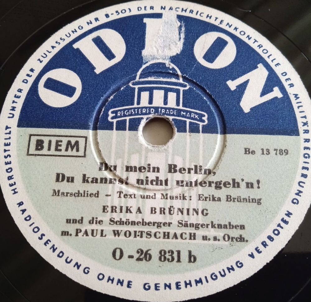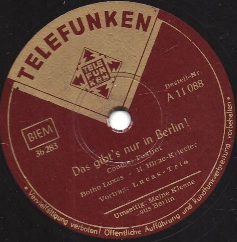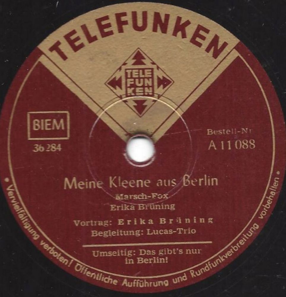 1951 Telefunken A 11088 ("Meene Kleene Aus Berlin" & Das LUCAS-TRIO) u. 1949/1950 Odeon (Erfolge 26845 "Hier In Berlin Hab‘ Ick Murmeln Gespielt"/"Ick Kann Doch Von Berlin Nicht Weg!", 26831 "Berliner Jungens, Die Sind Richtig!"/"Du Mein Berlin, Du Kannst Nicht Untergeh’n"-gern ließ sie sich stimmlich von den SCHÖNEBERGER SÄNGERKNABEN begleiten),