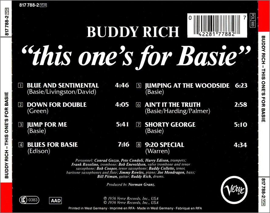 Personnel: Harry “Sweets” Edison (tp), Sonny Criss (as on #1-4), Barney Kessel (g on #5-12), Jimmy Rowles (p), John Simmons (b) and Buddy Rich (d).