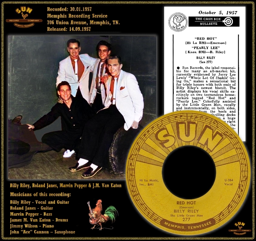 Auf dem Etikett der eben gehörten Platte liest man als Interpreten Billy Riley & His Little Green Men. Diese Green Men waren Musiker aus anderen Bands und ein Solist, nämlich Jerry Lee Lewis am Piano, Roland Janes, Gitarre, aus Lewis‘ Band, Jay B. und Clayton Perkins, die inzwischen verstorbenen Brüder von Carl Perkins und W.S. Holland, ebenfalls aus Perkins‘ Band, heute Drummer bei Johnny Cash. Übrigens, der verstorbene Gitarrist Luther Perkins, der den Johnny Cash-Aufnahmen den charakteristischen Sound gab, ist nicht mit Carl Perkins verwandt, wie im Cover-Text einer deutschen Country & Western-LP behauptet wird. Im Oktober 1957 machte Billy Riley seine dritte Platte, „Red Hot“, wieder mit Jerry Lee Lewis am Piano. „Red Hot“ ist eine Cover-Version von Billy „The Kid“ Emerson’s ‚My Gal Is Red Hot‘, das zwei Jahre vorher auf der gleichen Plattenmarke erschienen war.