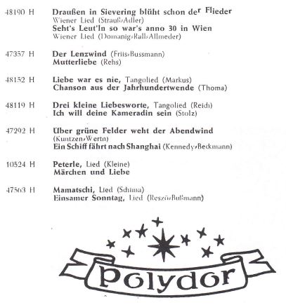 größte Erfolge mit "Peterle", "Mamatschi" u. "Ich Will Deine Kameradin Sein", Deutsche Grammophon, Polydor (u.a. "Ein Schiff Fährt Nach Shanghai", "Mamatschi", "Lili Marleen", "Peterle"), Ariola, 777 Schallplatten (u.a. "Bleib So Wie Du Bist Jonny"),