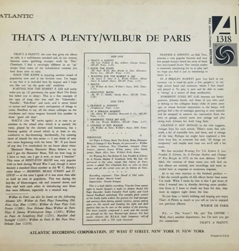 08 60....ATL 70.025....WILBUR DE PARIS & his new new orleans jazz..Mack The Knife (Atl.-1047)/Colonel Bogey's March (Atl.-1048) (ATLANTIC LP 1318/1300)