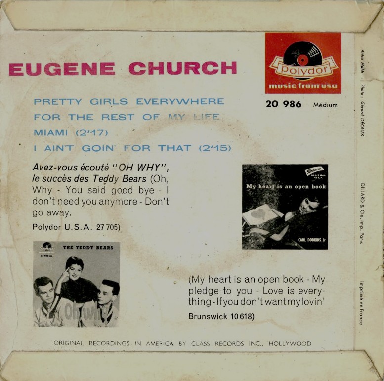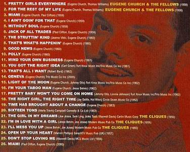 Eugene R. Church was born January 23, 1938, in St. Louis, Missouri, and grew up in Los Angeles, where his father was pastor at a church at 5th Avenue and West Adams. Though he was a beautician and beauty shop operator by trade, Eugene is best known for his brief stint as an R&B artist in the 1950s, beginning with his partnership with Jesse Belvin (with whom he dueted under various names). In 1958 he recorded a Top 40 hit, "Pretty Girls Everywhere," backed by Belvin, Gaynel Hodge and Tommy Williams, then overdubbed further with female voices (all of whom were credited as The Fellows). Later on, Church pursued a career in gospel music in Texas. He died in Los Angeles on April 16, 1993.