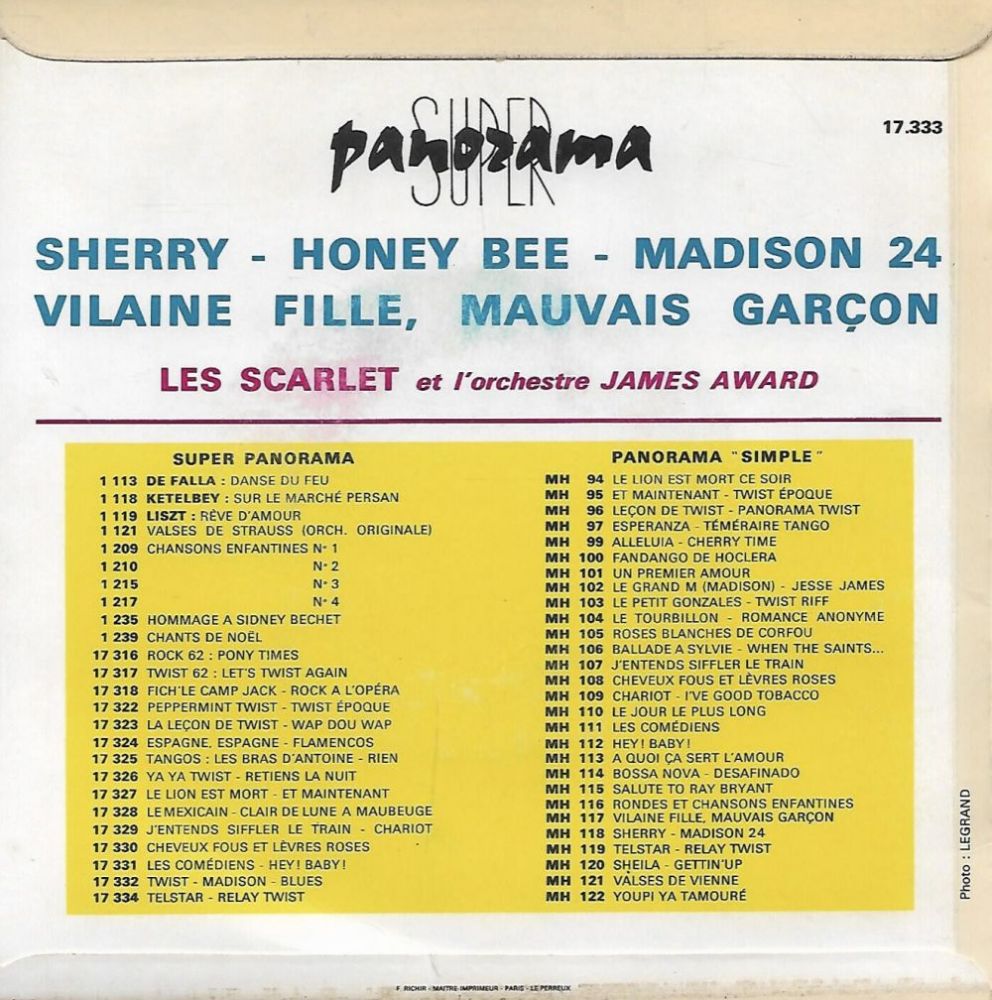 Laut Discogs sollen die Les Scarlet aus Frankreich eine Girl-Group gewesen sein, und das halte ich für etwas untertrieben, weil sich die armen Girls gegen die Männermassen kaum durchsetzten konnten. Ich vermute, das Label PANORAMA war in Frankreich so etwas wie bei uns TEMPO oder EMBASSY in England etc., das den Namen Les Scarlets für seinen Hintergrundchor, der für die diversen Einspielung von Cover-Versionen herangezogen wurde und sehr unterschiedlich besetzt war, verwendet hat. Bestätigung gibt es dafür aber noch keine.