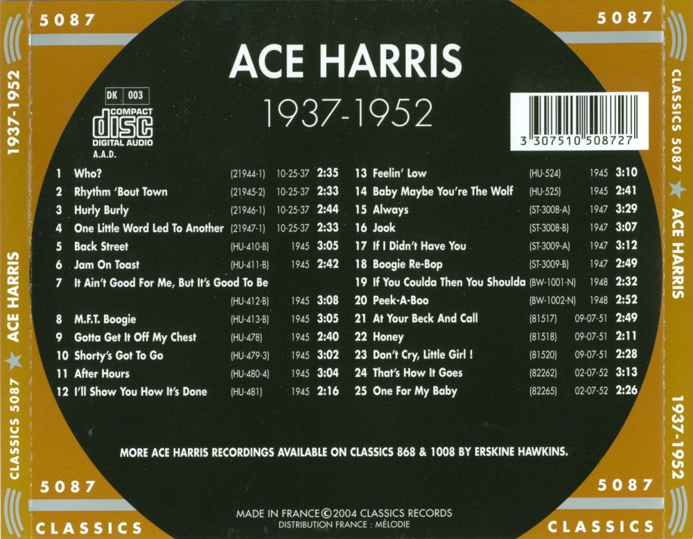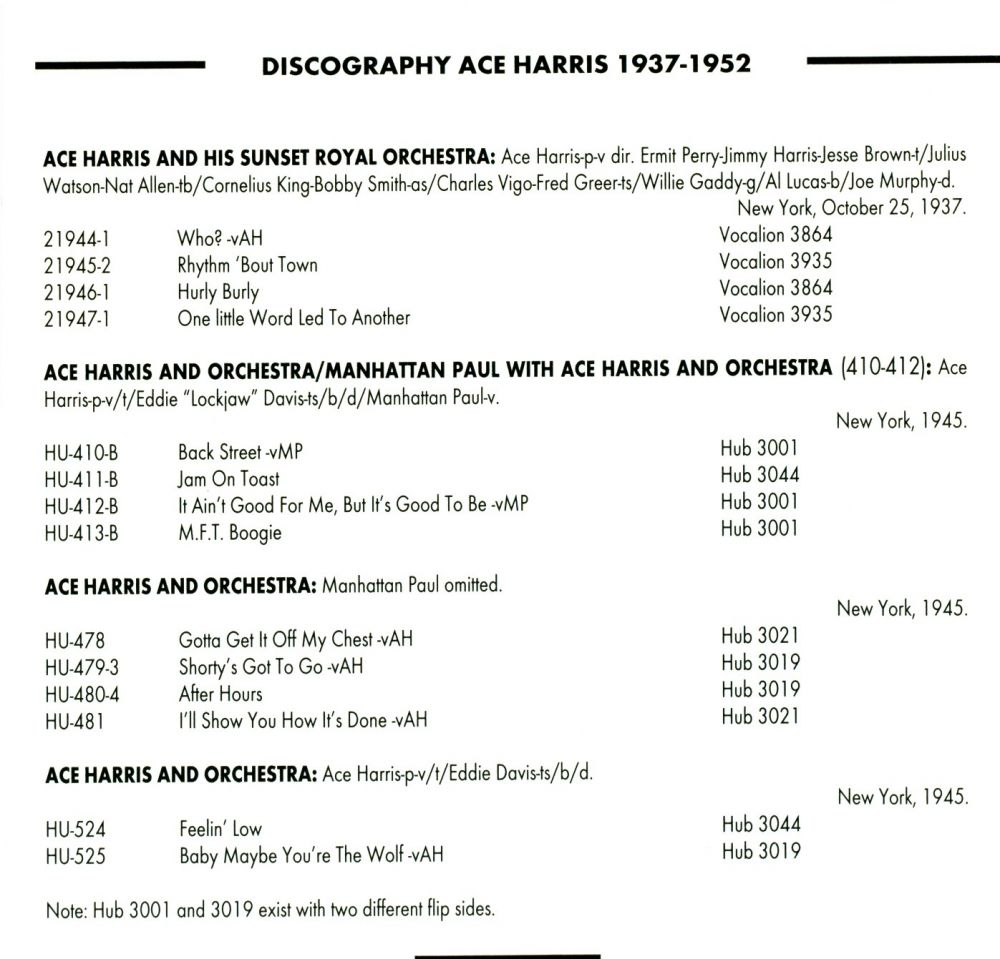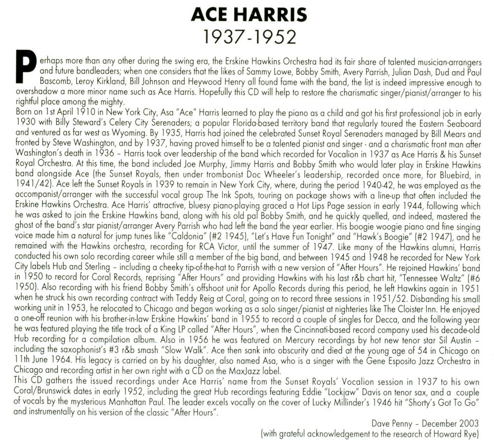 Diese CD enthält die unter Ace Harris' Namen veröffentlichten Aufnahmen von der Vocalion-Session der Sunset Royals 1937 bis zu seinen eigenen Auftritten in Coral/Brunswick Anfang 1952, darunter die großartigen Hub-Aufnahmen mit Eddie "Lockjaw" Davis am Tenorsaxophon und einigen Gesangseinlagen des geheimnisvollen Manhattan Paul. Der Sänger glänzt gesanglich auf dem Cover von Lucky Miltinders Hit “Shorty's Got To Go“ aus dem Jahr 1946 und instrumental auf seiner Version des Klassikers “After Hours“.