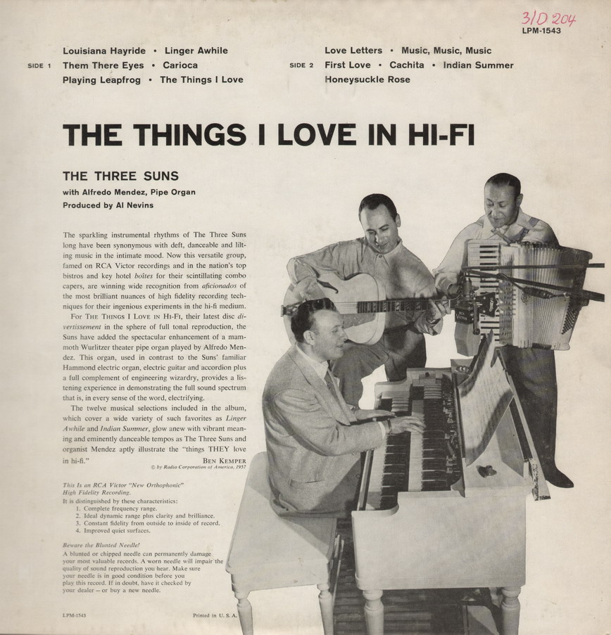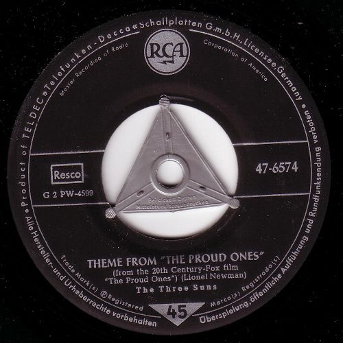 Ich war gestern wieder bei meinem Händler und habe eine von mir noch nie gehörte Fassung von "Theme From 'The Proud Ones'" entdeckt. Zwar nichts außergewöhnliches, aber ich fand diese Version so interessant, dass ich sie meiner Sammlung einverleibte. Die Interpreten heißen The Three Suns und die gab es auch bei uns auf der deutschen RCA. An's Forum denkend wollte ich etwas mehr über diese Gruppe erfahren, was sich aufgrund des häufigen Mitgliederwechsels bei dieser Gruppe als sehr schwierig gestaltete. Aber ich konnte mein Wissen wieder um einige interessante Dinge erweitern. Gegründet wurde das Trio 1939 von den Brüdern Morty Nevins (Akkordeon) & Al Nevins (Gitarre) gemeinsam mit ihrem Cousin Artie Dunn (Orgel). Bald verließ Al Nevins die Gruppe, weil er mit Don Kirshner den Musikverlag ALDON gründete, der später auch solche Schreib-Duo-Kapazitäten wie Sedaka/Greenfield förderte und beherbergte. Er hatte bald, was Songrechte betraf, einen riesig grossen Einfluß im Musik-Geschäft.