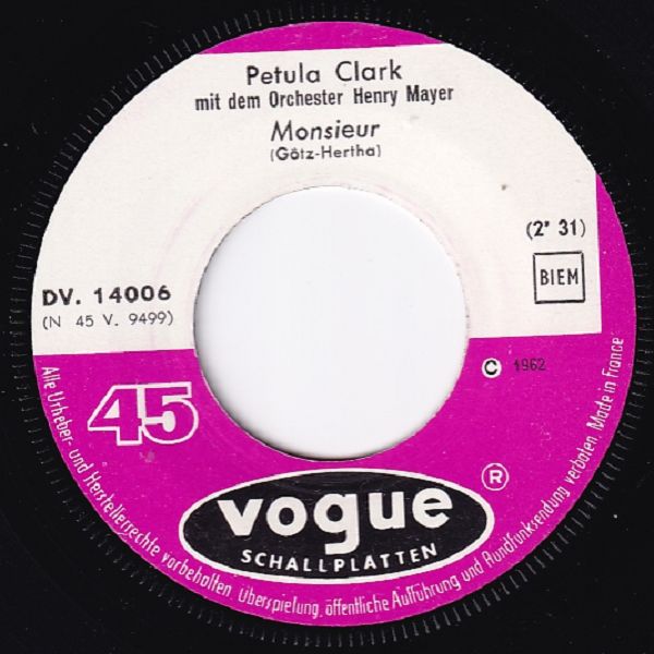 Im Jahre 1962 schrieb Karl Götz für Petula Clark die erste deutschsprachige Aufnahme „Monsieur“ und Kurt Hertha lieferte den Text dazu. Eigentlich ist „die erste deutschsprachige Aufnahme“ nicht korrekt, da Petula bereits im Jahre 1961 ihre ersten deutschsprachigen Aufnahmen einspielte, allerdings in ihrer Heimat England und mit britischen Orchestern und die Titel „Du bist mein Anfang und mein Ende“ und „St. Tropez“ gab es dann 1961 bei uns auf der Export-Serie von PYE mit der Bestellnummer 7N.3104. „Monsieur“ war aber ihre erste deutschsprachige Aufnahme mit einem deutschen Orchester. Ihre „echte Erste“ gab es übrigens dann nochmals im Jänner 1963 auf der deutschen VOGUE als DV. 14027.