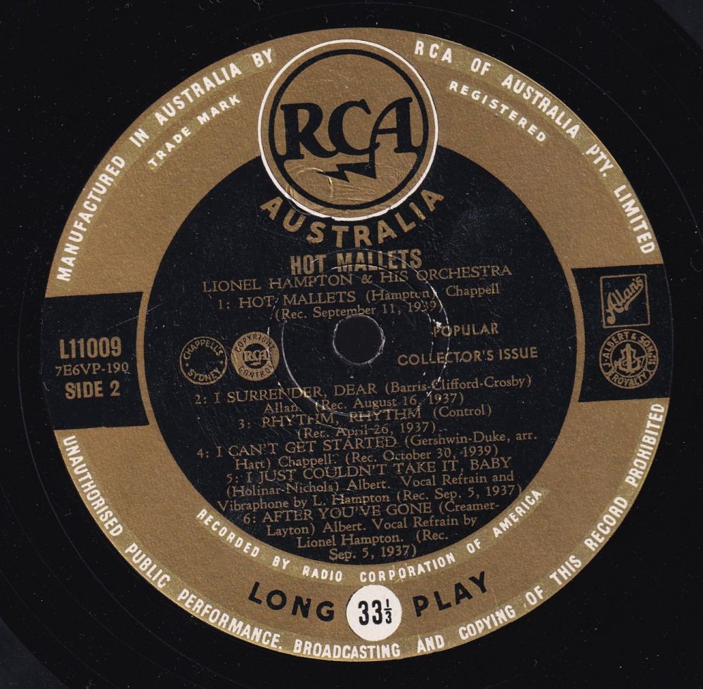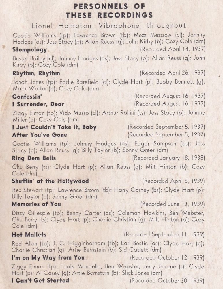 Ziggy Elman (tp), Hymie Schertzer (as), Russell Procope (sop, as), Chu Berry, Jerry Jerome (ts), Clyde Hart (p), Danny Barker (g), Milt Hinton (b), Cozy Cole (dm-except 37617), Lionel Hampton (vib, vo, dm-37617).