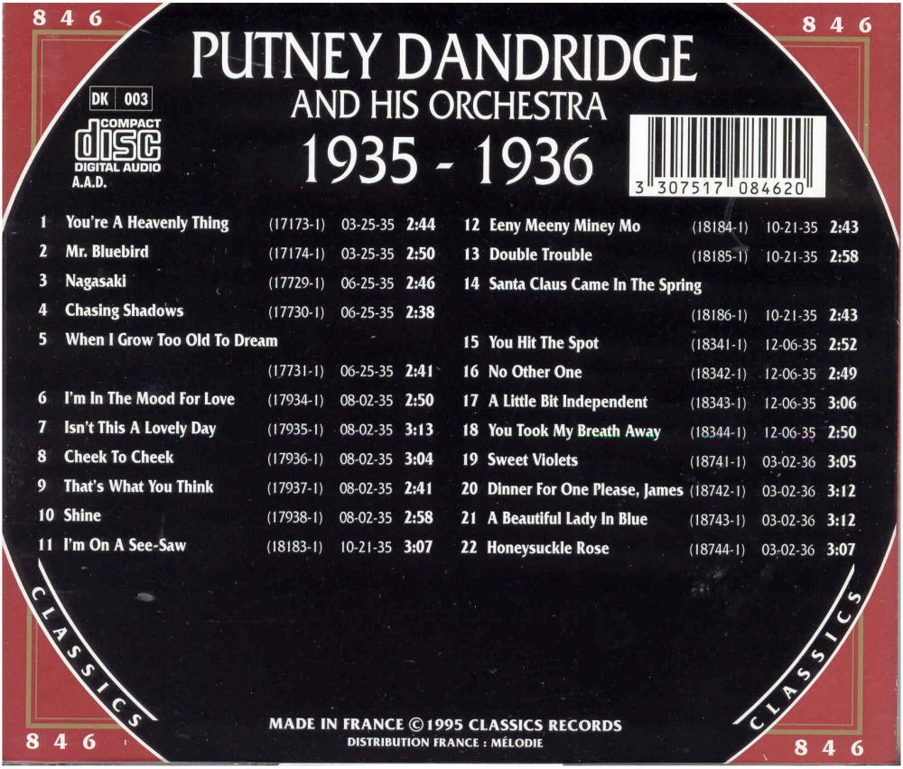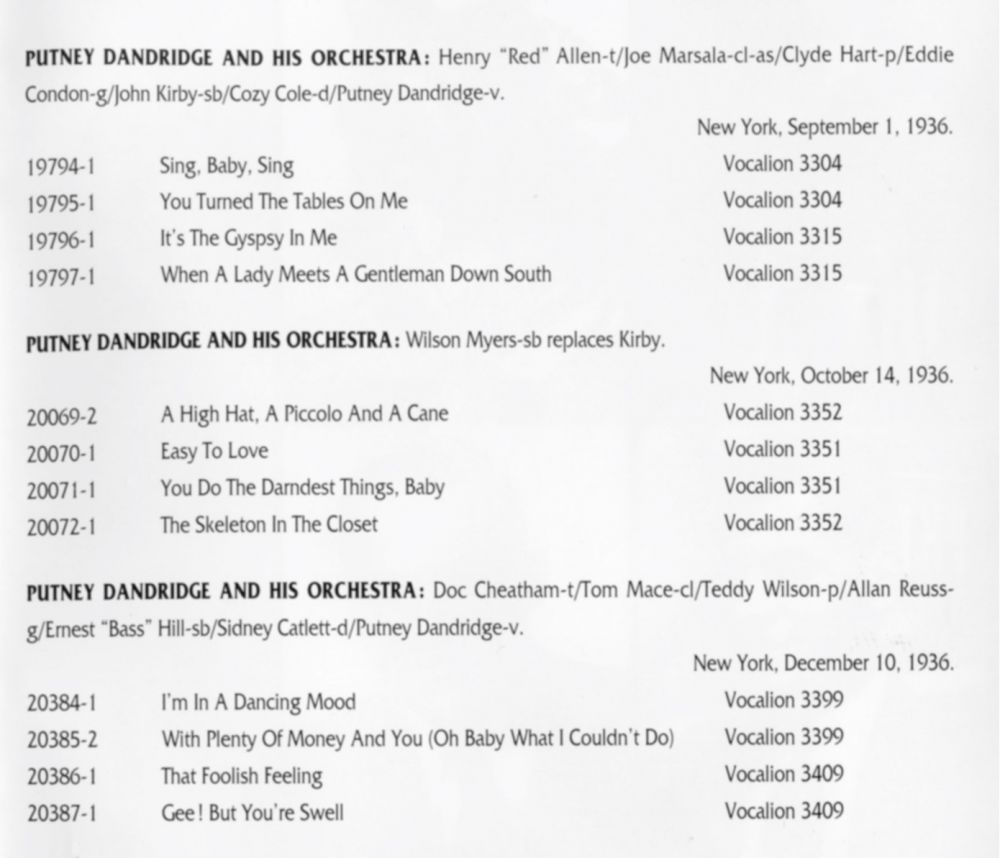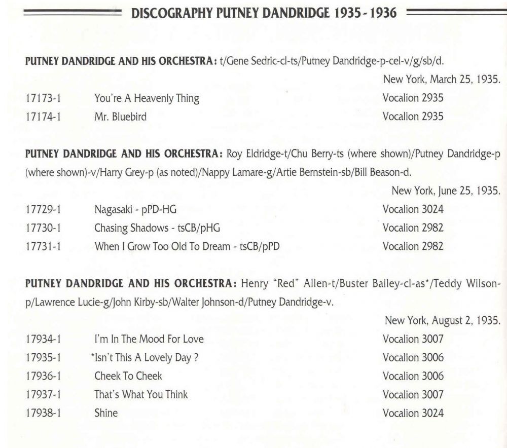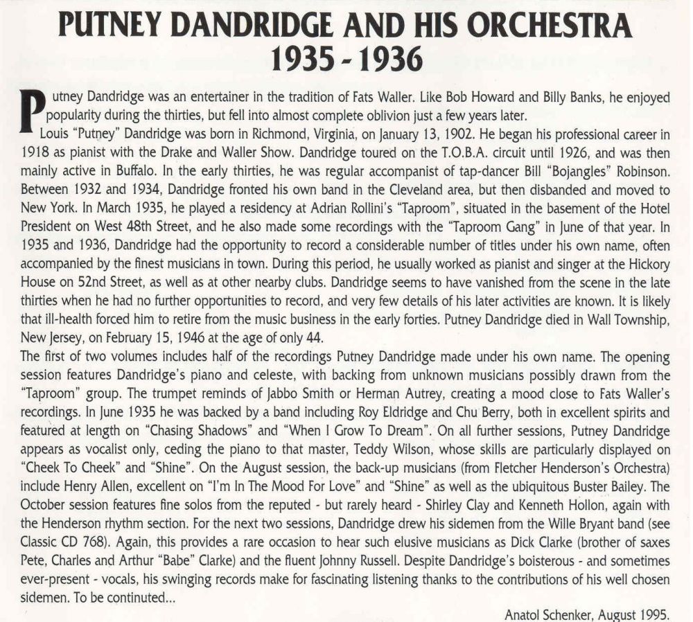 Louis Dandridge, US-amerikanischer Jazzpianist, Bandleader und Sänger. Geboren: 13. Januar 1902 in Richmond/Virginia. Gestorben: 15. Februar 1946 in Wall Township/New Jersey. 1930 gründete Putney mit dem begleitenden Stepptänzer Bill "Bojangles" Robinson seine eigene Band, zu der auch der Gitarrist Lonnie Johnson gehörte, die in den wichtigsten Clubs von New York City spielte. Registriert wurde sein Mitwirken bei den bedeutendsten Jazzkünstlern dieser Zeit wie Roy Eldridge, Teddy Wilson, Henry "Red" Allen, Buster Bailey, John Kirby, Chu Berry, Cozy Cole und vielen anderen.