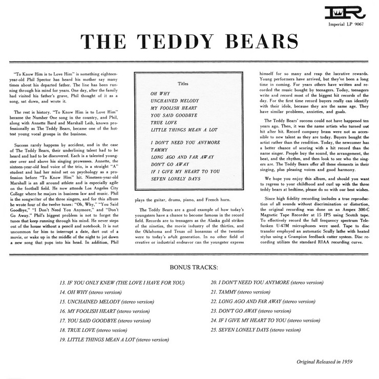 Bei der Popularität der Teddy Bears, zumindest der ihres Titels "To Know Him, Is To Love Him" (stand angeblich auf dem Grabstein von Phil Spector's Mutter), wundert man sich, dass es von den Teddy Bears bei uns lediglich eine Single gab (bis 1962). Die Teddy Bears bestanden aus Annette Kleinbard, geb. 1940; Marshall Lieb, geb. 26.1.39 und Phil Spector, geb. 26.12.39. Man kann sagen es war der Beginn von Phil Spector's Karriere