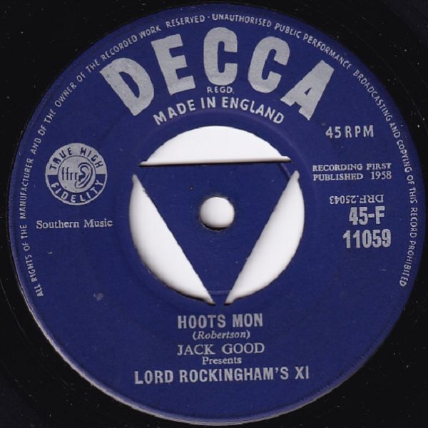 ”Hoots Mon” von Lord Rockingham’s XI (GB: DECCA 45-F 11059; D: DECCA D 18 859): (links klicken)