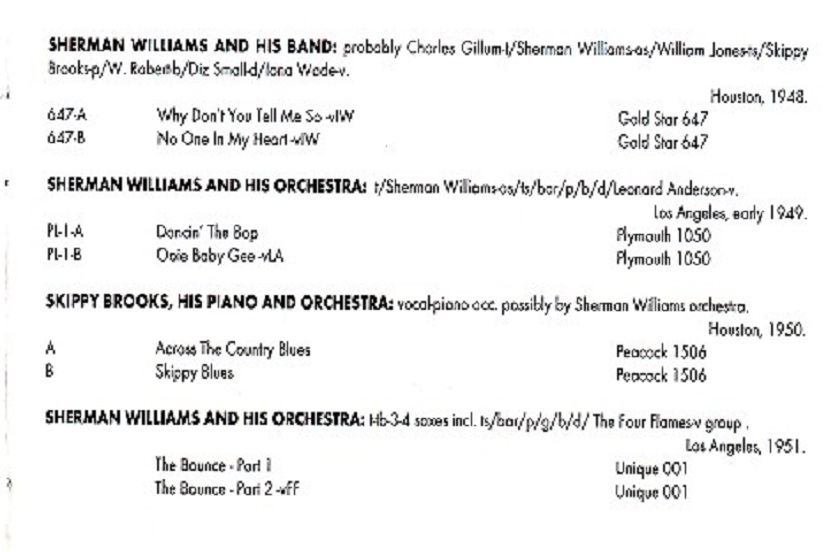 Einen letzten Titel nahm Sherman Williams 1956 für Flip Records auf. Auch wenn sie bei ihren musikalischen Unternehmungen nie etwas anderes als lokalen Erfolg erlebten, hinterlässt Williams‘ Band, wie unzählige andere kleine Swing- und Jump-Blues-Combos dieser Zeit, ein kleines, aber solides Werk.