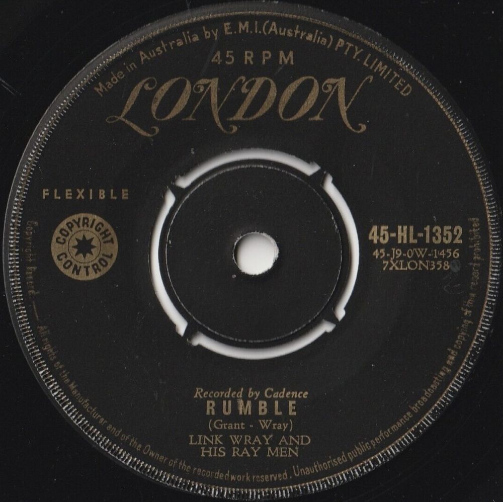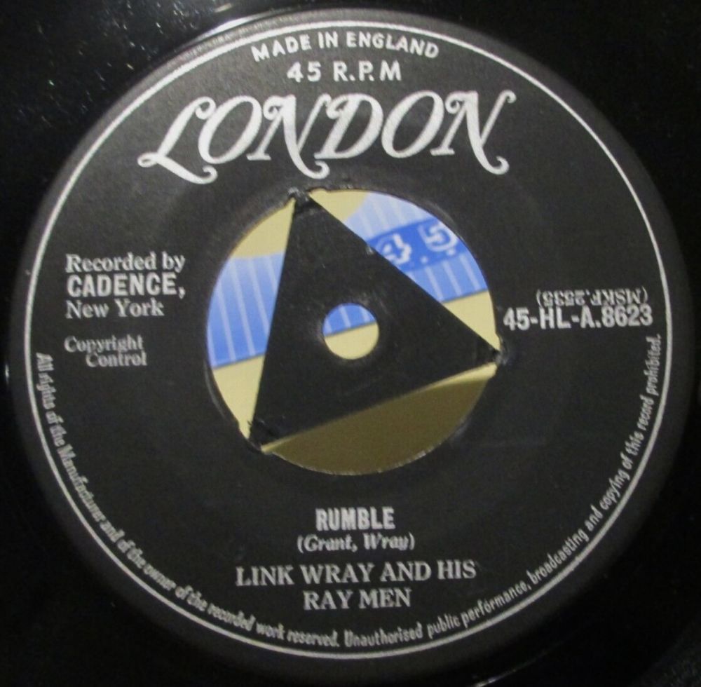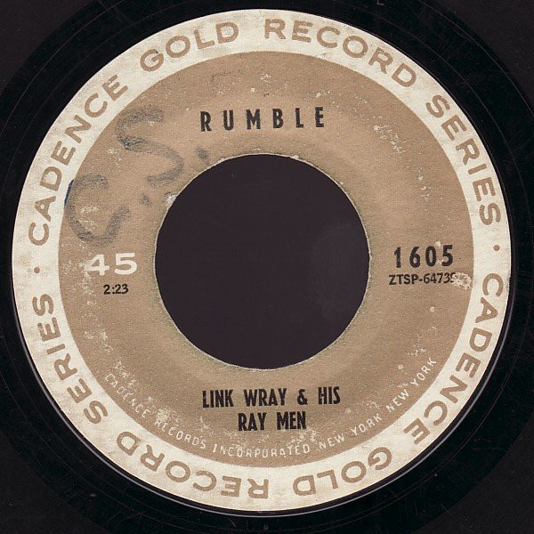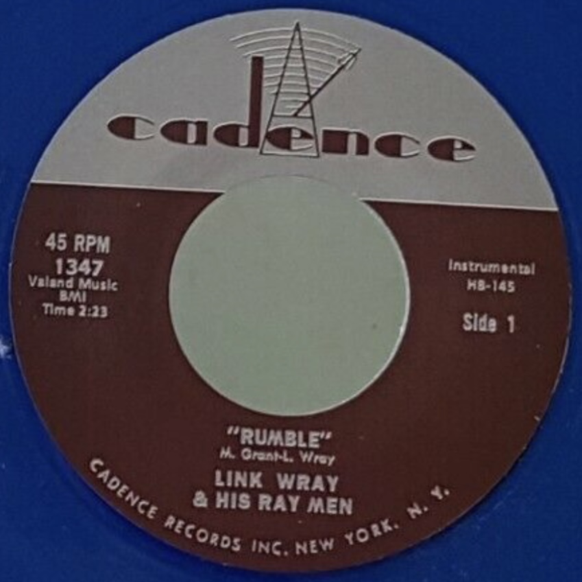 Link Wray’s 1958 hit “Rumble” on the Cadence record label – a short lived venture for Wray, who would later move on to other record labels.