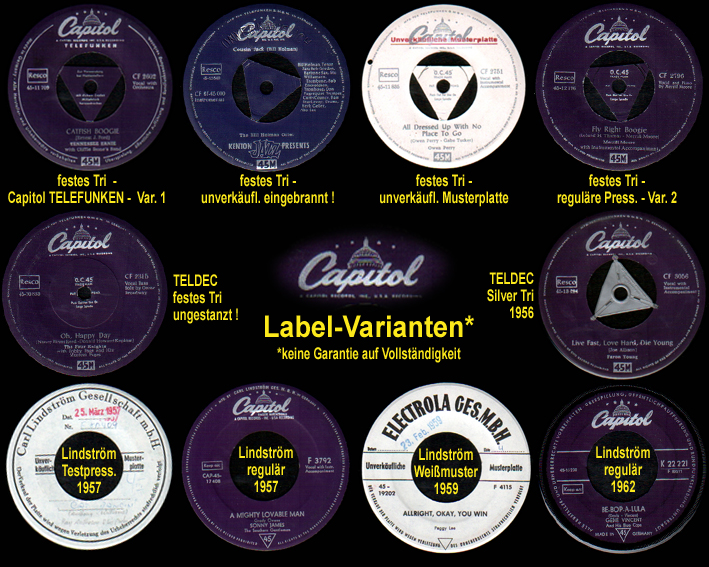 habe ich mich mal in Arbeit gestürzt und die vier verschiedenen Firmellochcover (beim letzten gezeiten gab es noch eine Variante mit einem weißen Balken oben) und außerdem alle mir bekannten Capitol-Labelvarianten eingescannt und als Bild zusammengefasst. :idea: