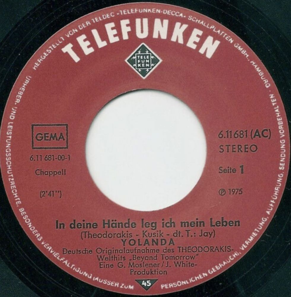 1975 In deine Hände leg' ich mein Leben (Beyond Tomorrow) / Mein Herz ist wegen Liebe geschlossen (Telefunken, 6.11 681 AC) - Produzent: Hans-Georg Moslener & Jack White