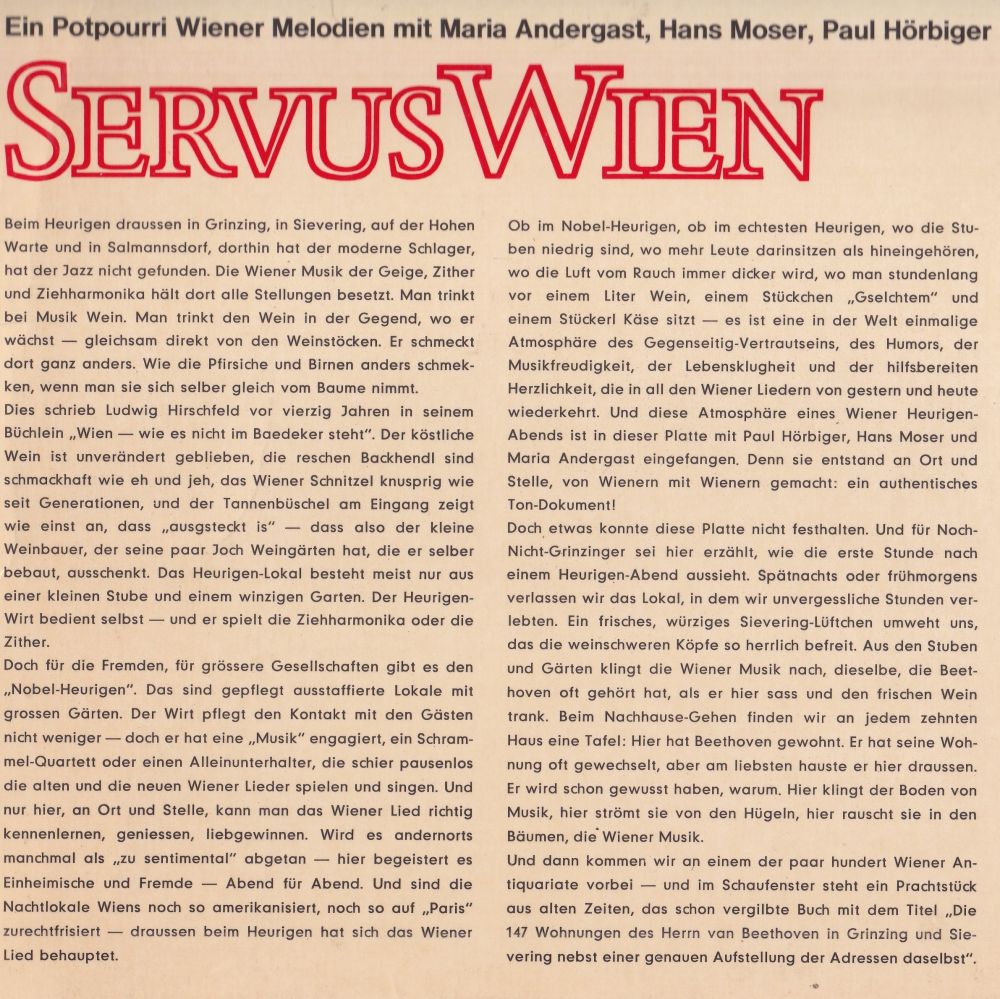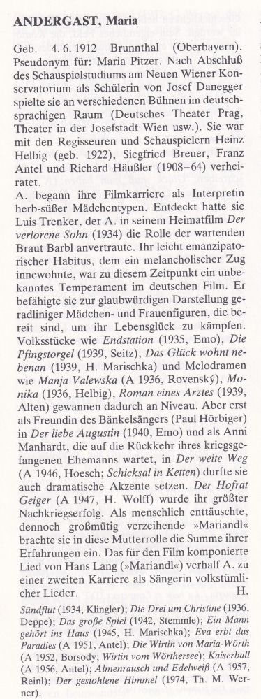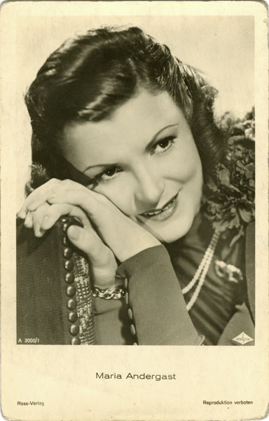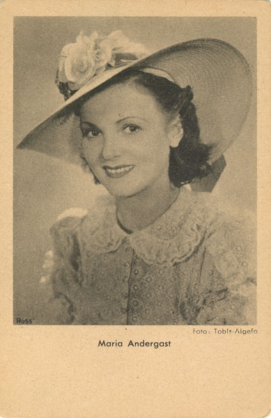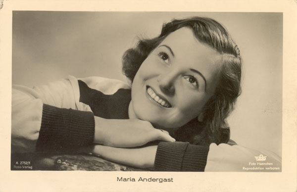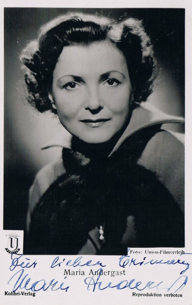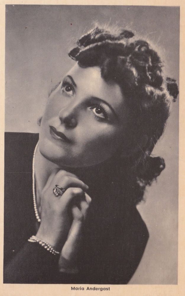 Die Schauspielerin und Sängerin Maria Andergast wurde am 4. Juni 1912 in Brunnthal an der Alz, Bayern, als Maria Pitzer geboren und verstarb am 14. Februar 1995 in Wien, Österreich. Im Alter von zwei Jahren verlor sie ihre Eltern und wuchs bei Pflegeeltern in Wien auf, die eine Tochter namens Liesl hatten, und erhielt den Namen der Pflegeeltern Andergast. Ihr ursprünglicher Berufswunsch war Tänzerin, aber den Tanzunterricht musste sie wegen eines schweren Verkehrsunfalles aufgeben und nahm statt dessen Schauspielunterricht bei Josef Danegger und an der Akademie für Musik und darstellende Kunst in Wien. Ihr erstes Engagement hatte sie 1929 in Aussig in der damaligen Tschechoslowakei. Erst ab etwa 1948 kam nach diversen Theaterengagements und Filmrollen die Schallplatte dazu.