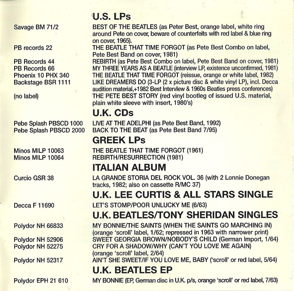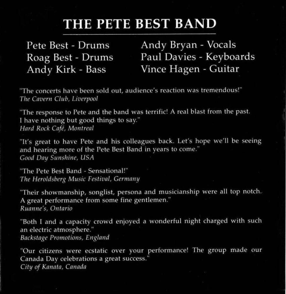 Während sich auf der ersten CD keine Beatles-Titel befanden, spielte die Pete Best Band im Cavern-Club zwei Stücke der Beatles. Auf einer weiteren CD, 1996 unter dem Titel “…once a beatle, always …“ erschienen, spielte die Pete Best Band acht Beatles-Stücke, darunter auch Titel aus dem Spätwerk der Beatles wie “Revolution“ oder “Back in the USSR“.