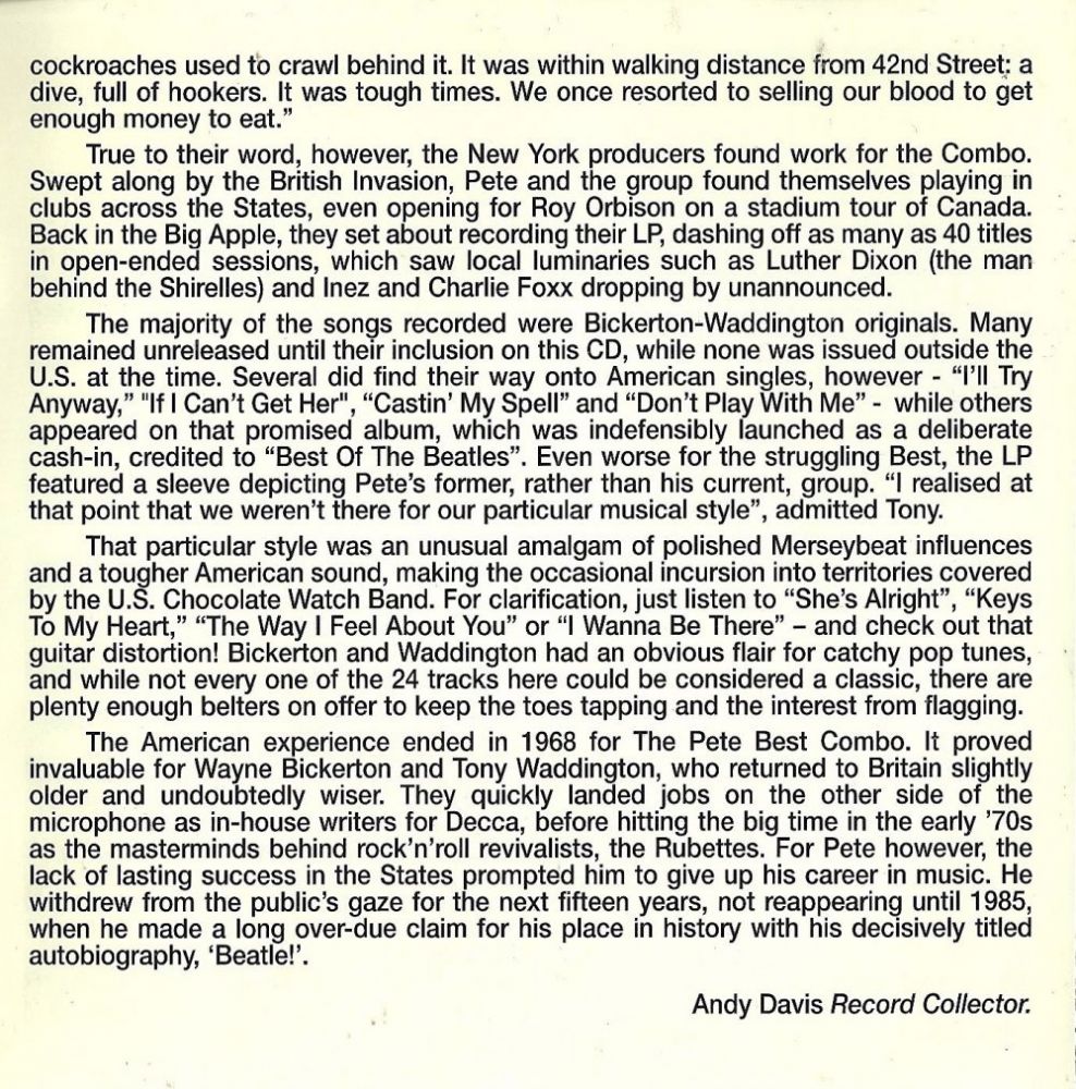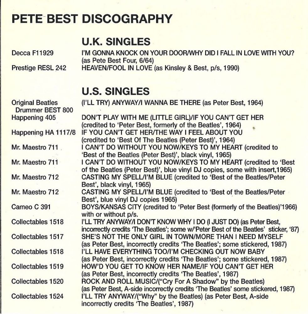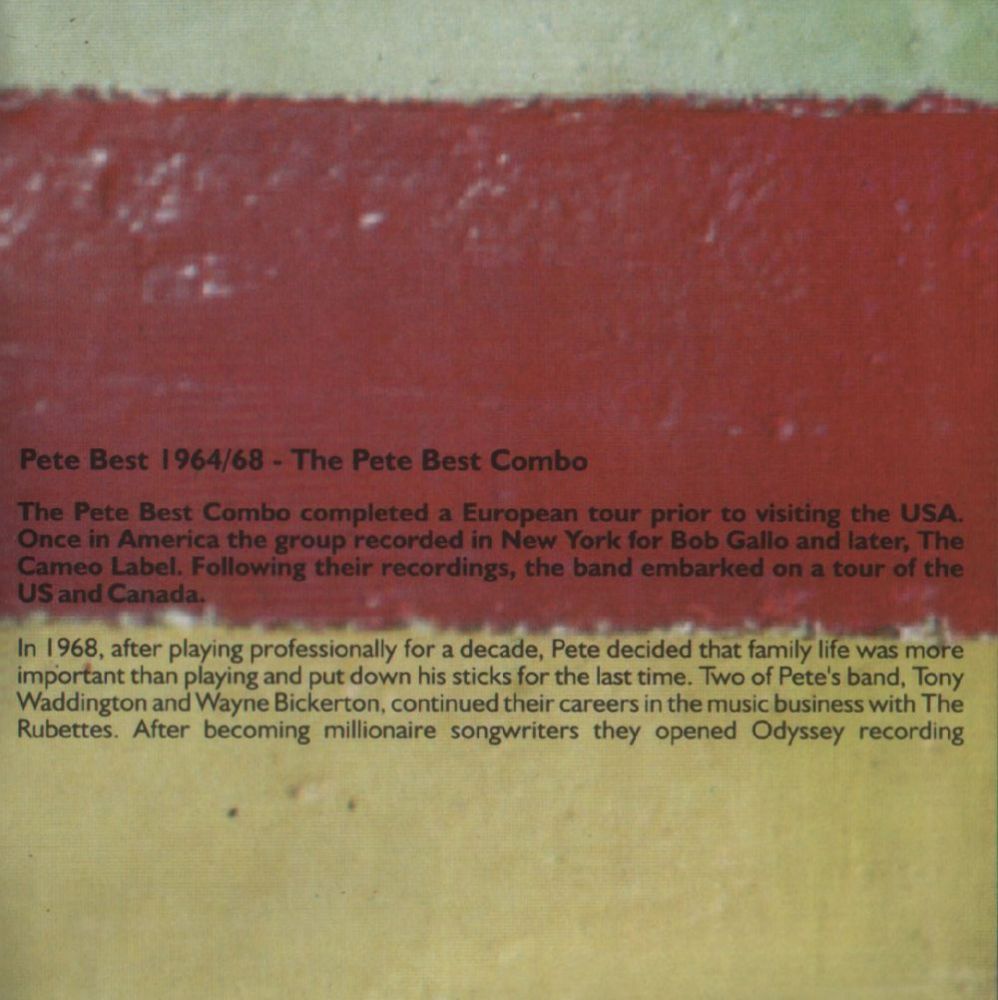 Im Jahr 1996 stellte Pete Best auf seinem eigenen Plattenlabel eine Zusammenstellung seiner musikalischen Aktivitäten der Jahre 1964–1966 unter dem Titel “The Pete Best Combo, Beyond the Beatles 1964–66“ zusammen. Die CD ist eine Werkschau über seine Aktivitäten nach den Beatles.