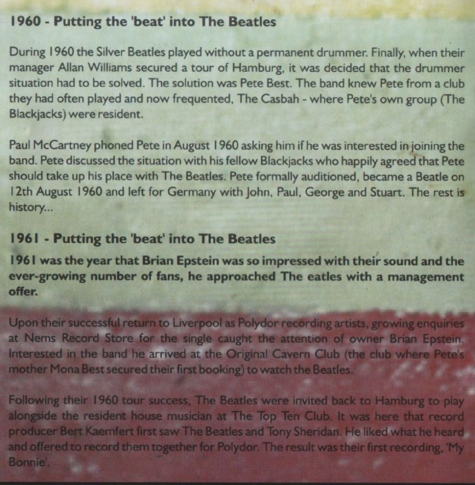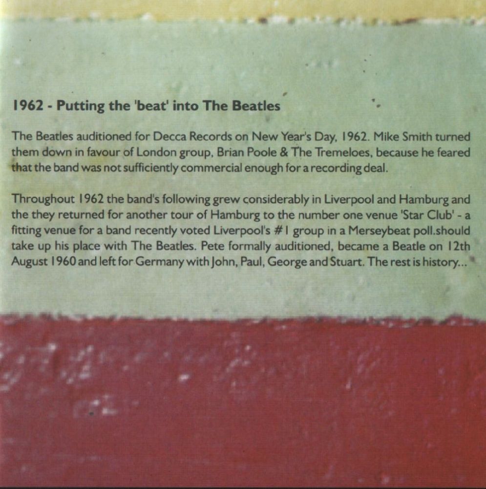 Am 15. August 1962 spielten die Beatles zum letzten Mal gemeinsam mit Pete Best. Einen Tag später teilte Brian Epstein ihm mit, dass die anderen ihn nicht mehr in der Gruppe haben wollten. Die Beatles spielten einige Tage mit dem Ersatzschlagzeuger Johnny Hutchinson von der Band The Big Three, ehe Ringo Starr am 18. August zu ihnen stieß.