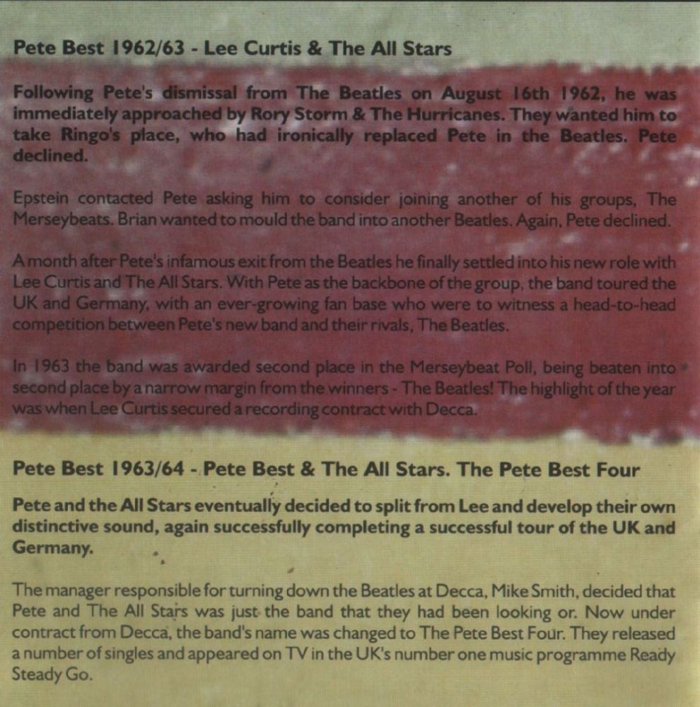 Nach der Rückkehr der Gruppe nach England kam es durch Solo-Ambitionen von Lee Curtis zum Bruch der Band. Während Lee Curtis eine neue Formation auf die Beine stellte, beschloss der Rest der Band, von nun an als Pete Best And The All Stars weiterzumachen. Kurz darauf benannte man sich in Pete Best Four um.
