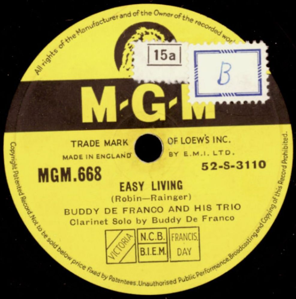 02 53....K11453....BUDDY DE FRANCO and his QUARET Buddy De Franco, Clarinet; Kenny Drew, Piano; Jimmy Raney, Guitar; Teddy Kotick, Bass; Arthur Taylor, Drums..Oh, Lady Be Good (53-XY-112)/BUDDY DE FRANCO and his TRIO Buddy De Franco, Clarinet; Kenny Drew, Piano; Dillon Russell, Bass; Art Blakey, Drums..Easy Living (52-XY-3121)