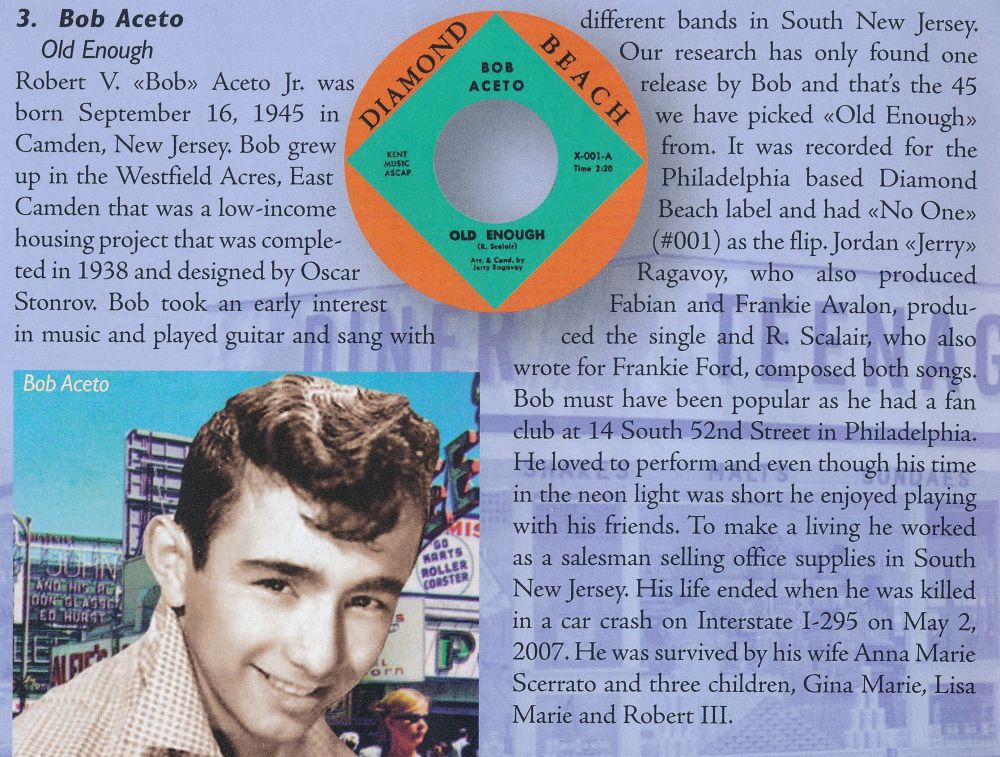 Der Gitarrist und Sänger Bob Aceto wurde am 16. September 1945 in Camden, New Jersey, als Robert V. Aceto Jr. geboren und verstarb am 2. Mai 2007, erst 61-jährig, auf der Interstate I-295 an den Folgen eines Autounfalles. Er wuchs in der Wohnsiedlung Westfield Acres im Osten von Camden auf, lernte Gitarre, sang und spielte dann auch sehr oft bei diversen Bands in Süd-Jersey und spielte im Jahre 1960 bei DIAMOND BEACH, einem Label aus Philadelphia, sogar eine Single ein. Das Jahr 1960, welches ich im Netz fand, ist aber mit Vorsicht zu genießen, denn da war Bob gerade erst 15 Jahre alt. Später lebte er mit Frau und Kindern im Pilesgrove Township im Salem County, südöstlich von Camden.