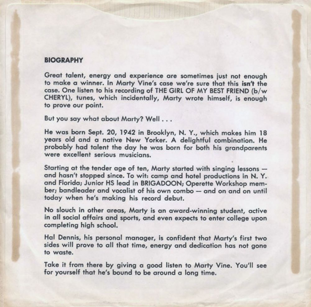 Der Sänger Marty Vine wurde am 20. September 1942 in Brooklyn, New York, geboren. Bei seiner ersten Single, die am 4. April 1960 auf den Markt kam, verwendete er die B-Seite von Charlie Blackwells Single von November 1959 ”The Girl Of My Best Friend" ebenfalls als B-Seite. Am 8. April kam die LP ”Elvis Is Back” auf den Markt, die diesen Titel ebenfalls enthielt. In Europa erlangte die Elvis-Version von ”The Girl Of My Best Friend" sogar Single-Status. Im April 1961 gab es die zweite Single von Marty Vine und danach dürfte es nichts mehr gegeben haben.