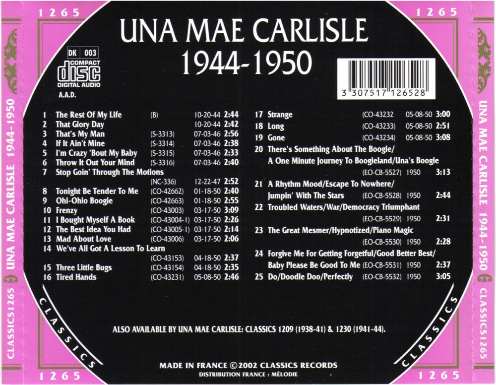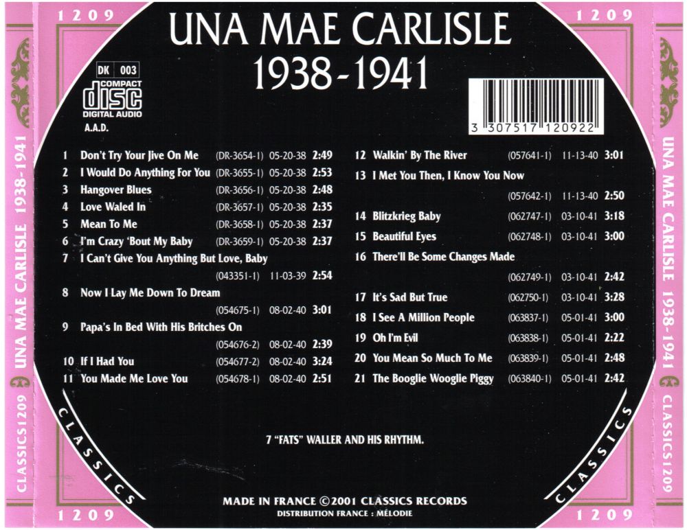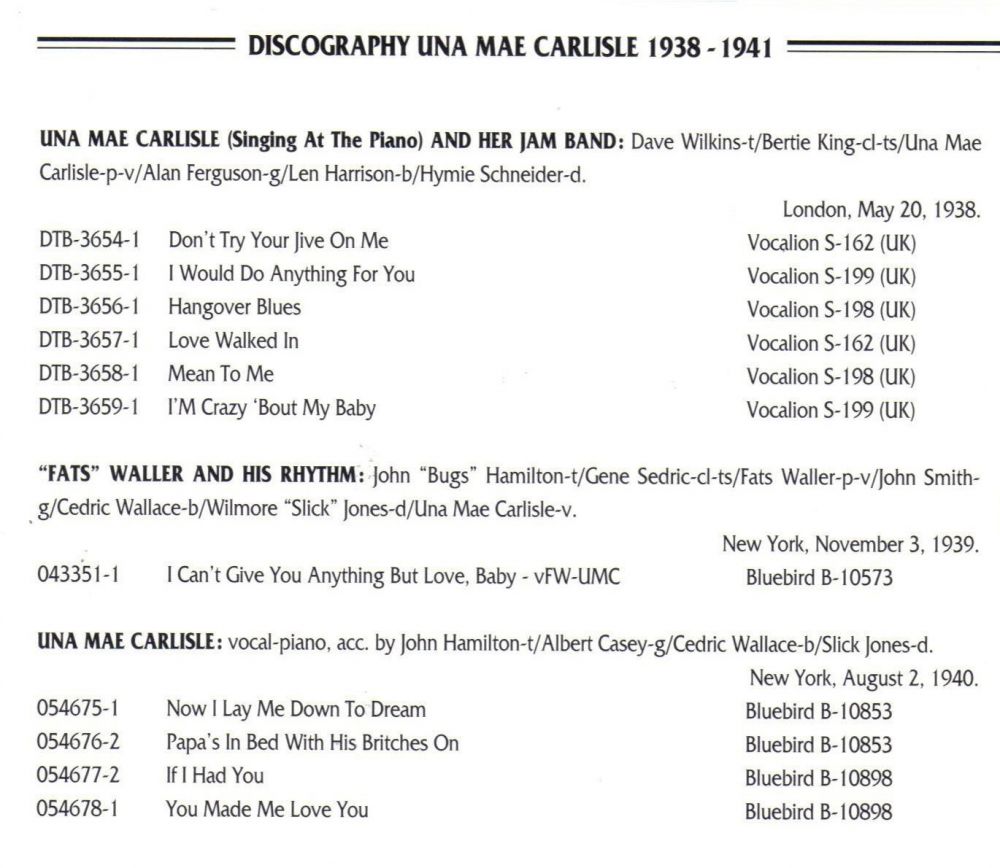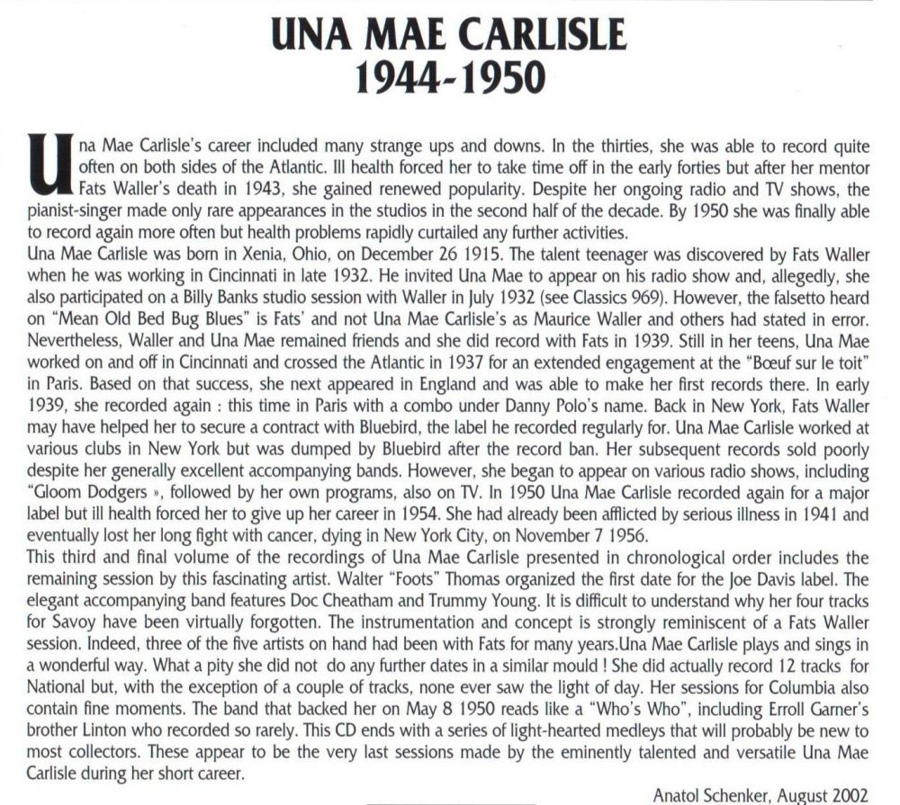 Una Mae Carlisle wurde 1932 von Fats Waller entdeckt, als sie noch eine Jugendliche war und in Cincinnati live und im Radio auftrat. Sie spielte bereits in einem Klavierstil, der seinem nachempfundenen war, und bewies ein echtes Gespür für die Bandbreite seines Materials, einschließlich Boogie-Woogie und Comedy.