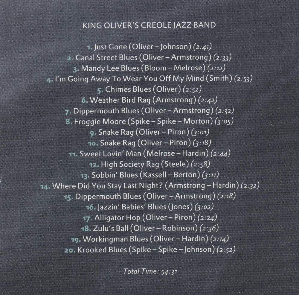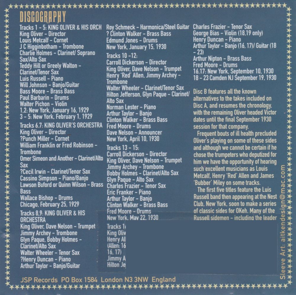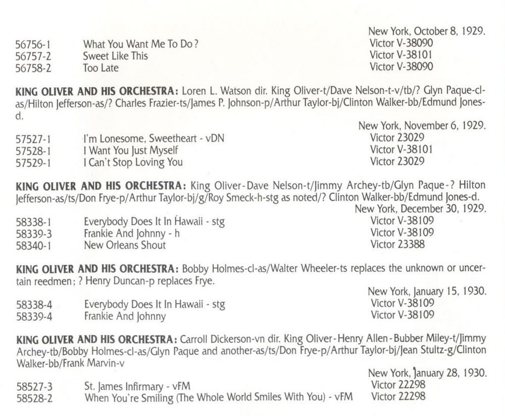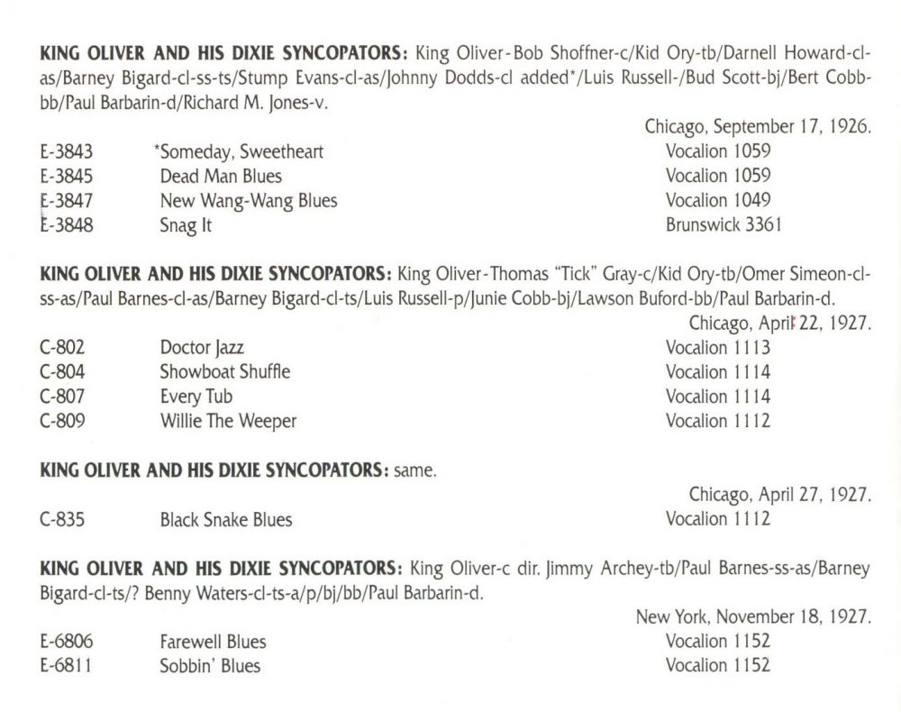Mitglieder: Altsaxophon – Billy Paige, Banjo – Bud Scott, Klarinette, Altsaxophon – Albert Nicholas, Kornett – King Oliver, Schlagzeug – Paul Barbarin, Klavier – Luis Russell, Sopransaxophon – Albert Nicholas (Titel: A), Barney Bigard (Titel: A), Billy Paige (Titel: A) Tenorsaxophon – Barney Bigard, Posaune – Kid Ory, Trompete – Bob Shoffner, Tuba – Bert Cobb