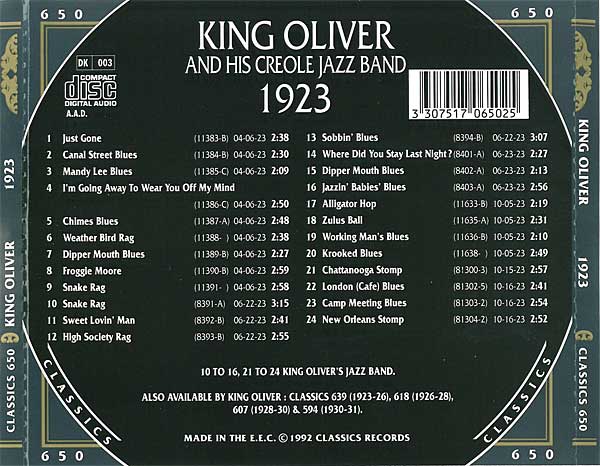Aufnahmen, die diese Gruppe 1923 für Gennett, Okeh, Paramount und Columbia gemacht hat, zeigt den New Orleanser Stil der kollektiven Improvisation, auch bekannt als "Dixieland", und macht ihn einem größeren Publikum zugänglich. Da sie akustisch in einen Trichter aufnahmen, das direkt mit der Nadel verbunden war, die das Plattenmaster bildete, musste Armstrong in der Ecke des Raumes stehen, weg vom Horn, weil sein kraftvolles Spiel die Nadel vom Master abprallen ließ. Darüber hinaus besuchten weiße Musiker die Lincoln Gardens, um von Oliver und seiner Band zu lernen. Da Lincoln Gardens in Chicagos schwarzem Viertel lag und nur Schwarze zuließen, hörten die weißen Spieler draußen in der Nähe der Eingangstür zu. Eine geplante Tournee in den Staaten des Mittleren Westens führte schließlich 1924 zur Auflösung der Band.