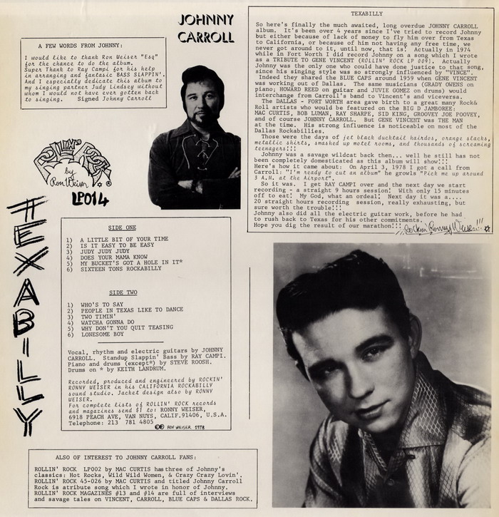 Ende der 60er Jahre zog Carroll sich aus dem Musikgeschäft zurück und arbeitete fortan als Buchhalter in einem Nachtclub. Dort wurde er einmal angeschossen, erholte sich jedoch wieder von der Verletzung, obwohl Nachrichten über den Tod Johnny Carrolls verbreitet wurden. Daraufhin entstand der Tribute Song “Johnny Carroll Rock“, geschrieben von Mac Curtis und Ronnie Weiser. Erst Mitte der 70er Jahre versuchte Carroll im Zuge des Rockabilly-Revivals wieder im Musikgeschäft Fuß zu fassen. Bei Ronnie Weiser’s Rollin‘ Rock-Label nahm er seit 1974 das Album “Texabilly“ und Singles auf und unternahm Auftritte in Europa. Insgesamt elfmal reiste er über den Atlantik, um auf verschiedenen Rock’n’Roll- und Rockabilly-Festen aufzutreten. Nebenbei ließ er sich als Tontechniker ausbilden und arbeitete in diesem Job bis 1977. Dabei lernte er das begabte, ehemalige Fotomodell Judy Lindsey kennen und tourte mit ihr als Judy & Johnny Band durch die Staaten. Beide gründeten dann 1978 ihr eigenes Gypsy-Label und veröffentlichten bis 1981 hauptsächlich eigenes Material auf Singles und Alben. Auf dem eigenen Gipsy-Label hatte Johnny Carroll über 15 Veröffentlichungen und in den 80er Jahren konnte er auch seinen europäischen Fans den Texas-Rockabilly näherbringen. Das Duo blieb bis zu Johnny’s Tod aktiv, ihren letzten Auftritt hatten sie am 10. Juni 1994 im Continental Club von Austin. Eine für September geplante Show musste abgesagt werden. Johnny litt zunehmend unter der Krankheit Hepatitis C.