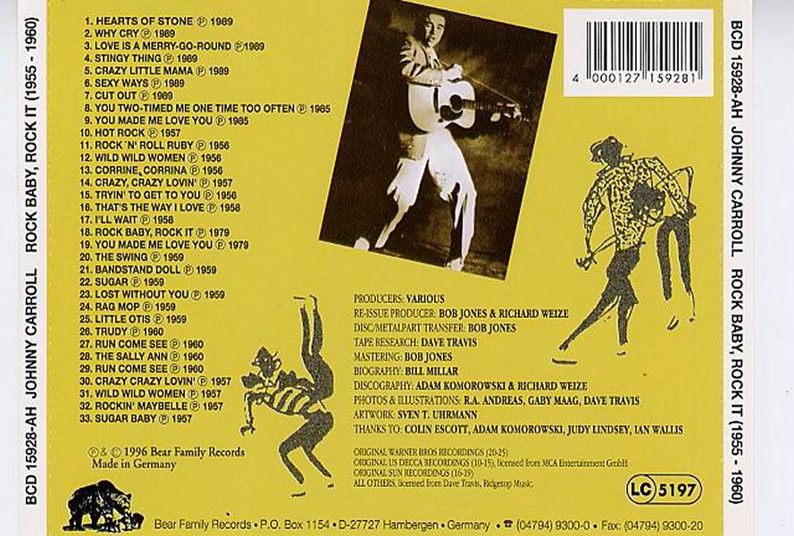 Johnny Carroll (John Lewis Carrell), * 23. Oktober 1937 in Cleburne/Texas als erster von drei Söhnen, + 18. Februar 1995 in Dallas/Texas, gilt als Sänger und Gitarrist als einer der typischsten Vertreter des Rockabilly-Genres. Bekannte Titel von ihm sind unter anderem “Hot Rock“, “Wild Wild Women“ und “Crazy Crazy Lovin‘“. Damals in den Fünfzigern war Johnny Carroll einer der Wildesten von allen. Für Fans von explosivem, unaufhaltsamem Rockabilly sind Johnny Carroll’s Titel genau das richtige.