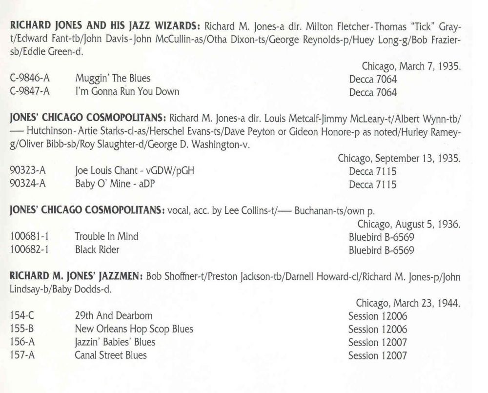 Richard M. Jones, der Komponist von “Trouble in Mind“, war für den Jazz vor allem als Leiter einer interessanten Reihe von Aufnahmeterminen von Bedeutung. Er spielte bereits 1902 Althorn und Kornett bei der Eureka Brass Band und arbeitete von 1908 bis 1917 als Pianist in New Orleans. Nachdem er mit Oscar Celestin (1918) gespielt hatte, zog Jones nach Chicago, wo er für Clarence Williams‘ Verlag arbeitete. Er nahm 1923 als Klaviersolist auf, begleitete Blanche Calloway und Chippie Hill bei Aufnahmeterminen (1925-1926) und leitete seine Jazz Wizards bei eigenen Aufnahmen von 1925 bis 1929. Zu Jones‘ Sidemen gehörten Albert Nicholas, Johnny St. Cyr, Ikey Robinson, Roy Palmer, Omer Simeon und einige weniger bekannte Musiker. Richard M. Jones blieb für den Rest seines Lebens in Chicago, leitete 1935-1936 und 1944 weitere Sessions und arbeitete in den 1940 er Jahren als Talentscout für Mercury. Alle seine Platten als Bandleader wurden auf zwei Classic-CDs neu aufgelegt.