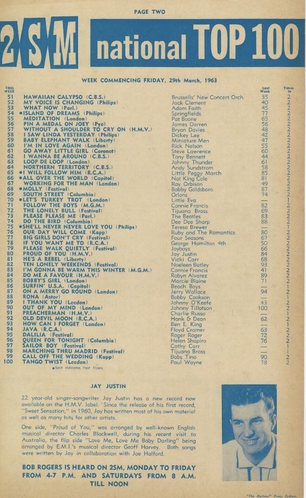 07 63….POP 1183….JAY JUSTIN with Orchestra directed by Charles Blackwell..Proud Of You (7XAA 1105)/JAY JUSTIN with Orchestra directed by Geoff Harvey..Love Me, Love Me, Baby Darling (7XAA 1106) (AUS: HIS MASTER’S VOICE 4512)