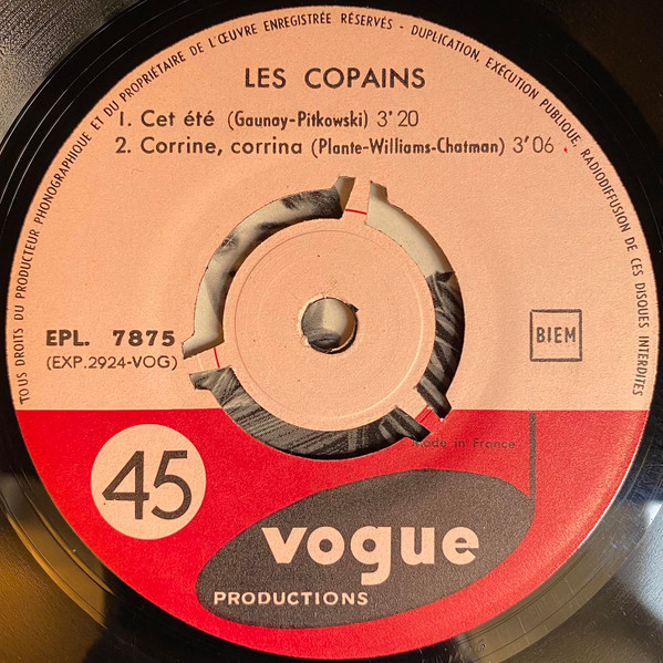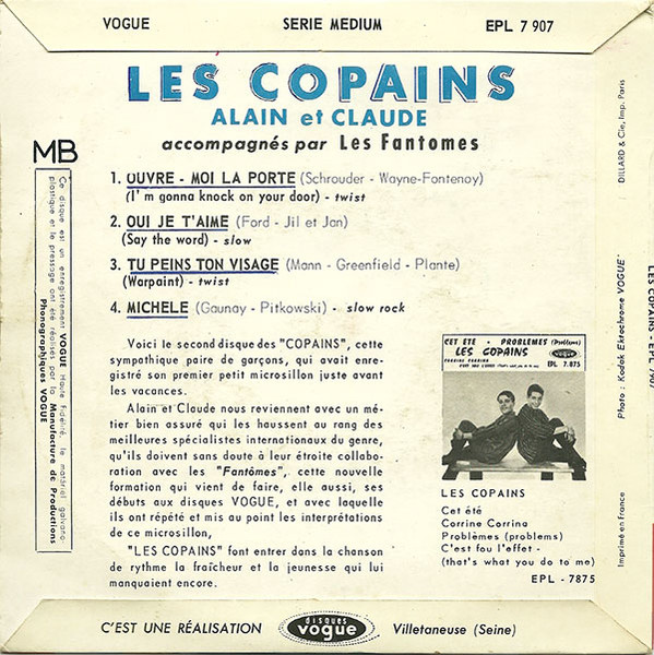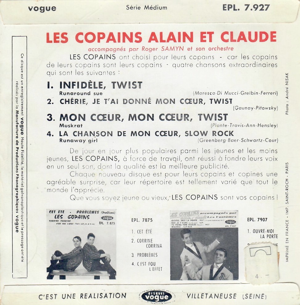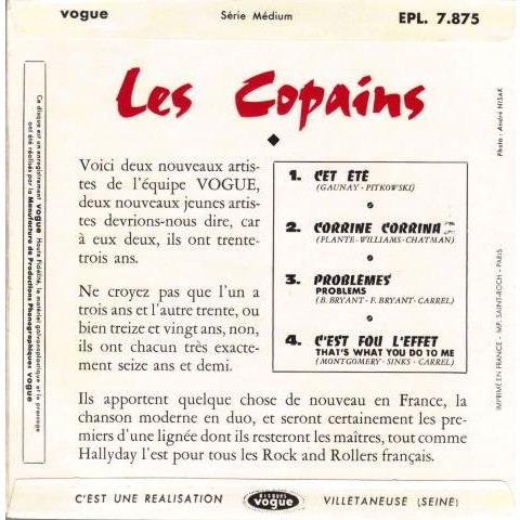 Alain GAUNAY est né le 30 juin 1944 et Claude PITKOWSKI le 17 octobre 1943, ils se rencontrent au Lycée Charlemagne à Paris et ils deviennent copains, ils chantent depuis 4 à 5 mois, leurs modèles sont américains, des groupes qui marient les harmonies vocales du doo-wop et la pop électrique : les Everly Brothers ou Dion and the Belmonts. Pour épater les amis, sur un pari, ils décident de participer à une audition pour l'émission « Salut les Copains » de Daniel Filipacchi, il les fait passer à l'émission télé seulement accompagnés de leurs guitares sur une chanson qu'ils avaient écrite, le public apprécie et Daniel Filipacchi terminera son commentaire par « vous entendrez parler deux ». Fort de ce succès, Alain décide de téléphoner aux maisons de disques. La première, les disques Vogue, les a convoqués pour une audition dans la semaine (ce devait être au mois de janvier 1961). Quelques jours après, appel téléphonique de Jacques Wolfson qui leur propose de signer un contrat pour enregistrer un disque 45T avec 4 chansons; étant mineurs il a fallu convaincre les parents de signer ce contrat, pour Claude il a fait la promesse de continuer le lycée afin de passer sa première partie du bac en fin d’année scolaire (ce qui fut fait). Pour réaliser ce 1er disque il ont obtenu l'autorisation de mettre leur chanson «Cet été» parmi les titres choisis par leur manager Jacques Wolfson, ces chansons étaient des traductions et adaptations de chansons américaines dont « Corinne, Corinna », chanson du répertoire Jazz et country déjà chantée par nombre d’artistes célèbres en anglais mais jamais en français et deux reprise de leurs idoles les Everly Brothers, « Problems » et « That’s what you do to me » . Les répétitions se font jusqu'en juin pour faire l'enregistrement juste après le bac et avant leur départ pour l'Angleterre afin de parfaire leur Anglais. Ils découvrent l'orchestre le jour de l'enregistrement en studio, ils n'ont jamais chanté avec des professionnels chargés d’assurer l’accompagnement musical de leurs voix, et c'est toute la difficulté : « Catastrophe dira Claude, nous n’avions jamais chanté avec un orchestre ni fait de play back ; résultat : impossible de réaliser une chanson entièrement d’une seule traite et avons du abandonner les studios pour attraper notre avion en laissant en plan musiciens, directeur artistique, et techniciens pensant que notre carrière s’achevait là avant d’avoir commencé » ... Mais voilà !... Durant leur séjour en Angleterre, en juillet, allongés sur la plage d’Hastings, qu'elle ne fut pas leur surprise d'entendre une chanson à la radio Europe1 : « Corrine Corrina », chantée par ….. « les Copains », leur nom d’artiste qu'ils découvrirent en même temps puisque jusqu’alors ils se faisaient appeler par leurs prénoms « Alain & Claude »; le disque avait été réalisé en coupant et collant les bouts de prises de son qui étaient propres à être éditées, un EPL 7.875 Vogue orchestré tout en sobriété par Roger Samyn, leurs chansons sont fort bien arrangées pour leurs voix. « En rentrant en France se souvient Claude, nous sommes allés, au sortir de aéroport ,sur les champs Élysées dans une grande maison de vente de disques acheter notre 1er 45 tours à la grande surprise des vendeuses qui nous ont reconnus en nous présentant la pochette ».