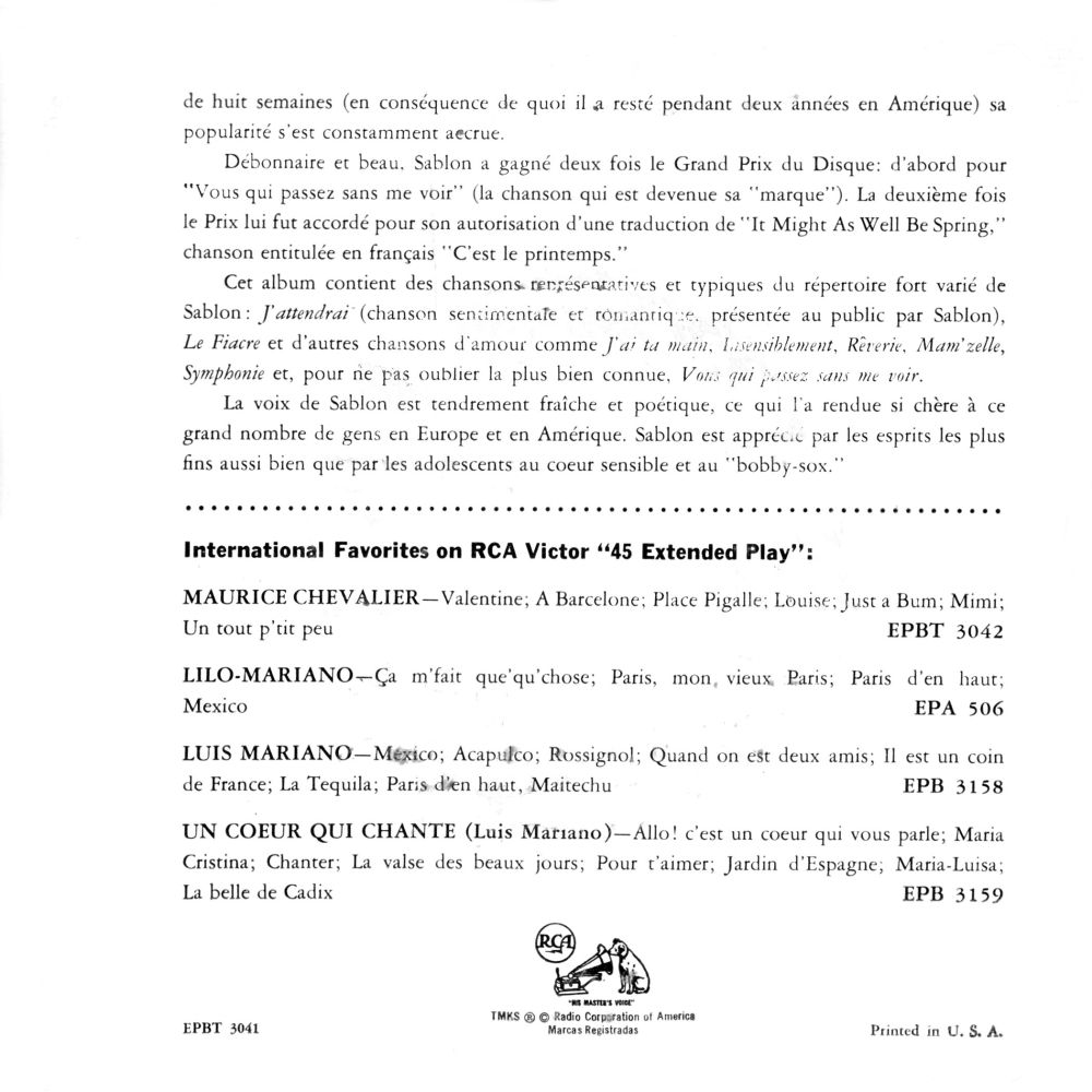 (* 25. März 1906 in Nogent-sur-Marne, Département Val-de-Marne; + 24. Februar 1994 in Cannes) war ein französischer Chansonnier ab den 1930 er Jahren. Sablon, der unter der Bezeichnung "Le Bing" als der französische Bing Crosby galt, interpretierte unter anderen Kompositionen von Mireille Hartuch und trat in Konzertsälen wie dem Olympia in Paris auf.