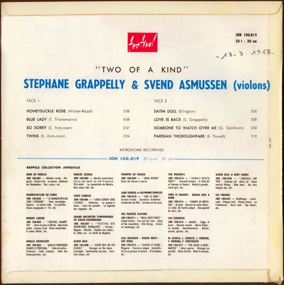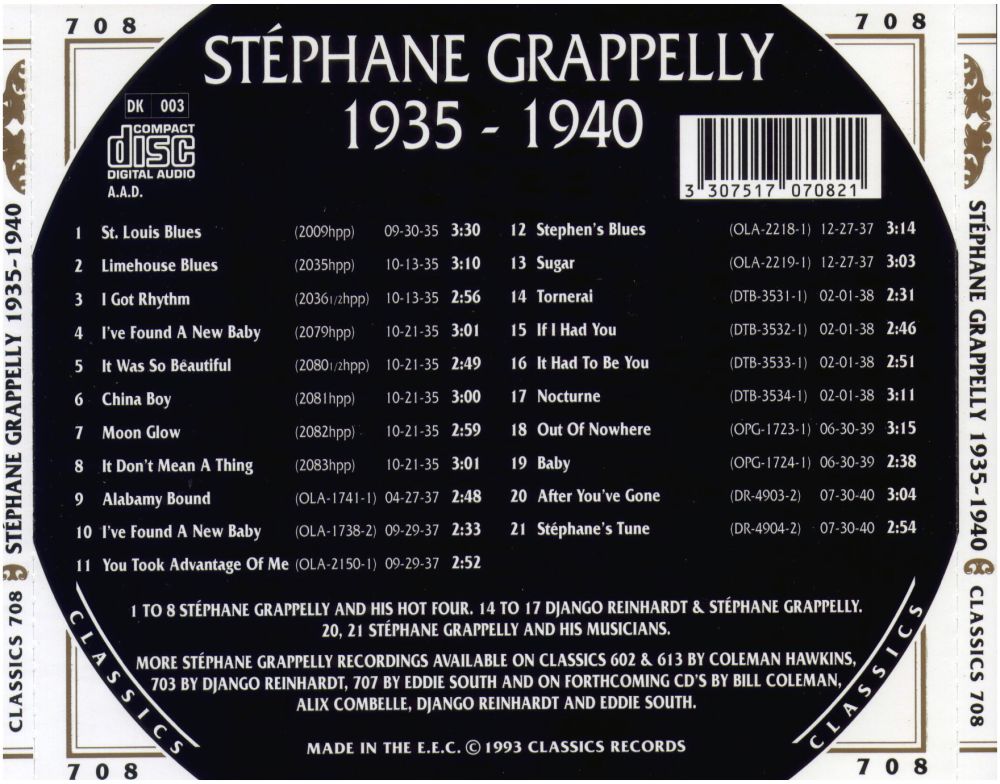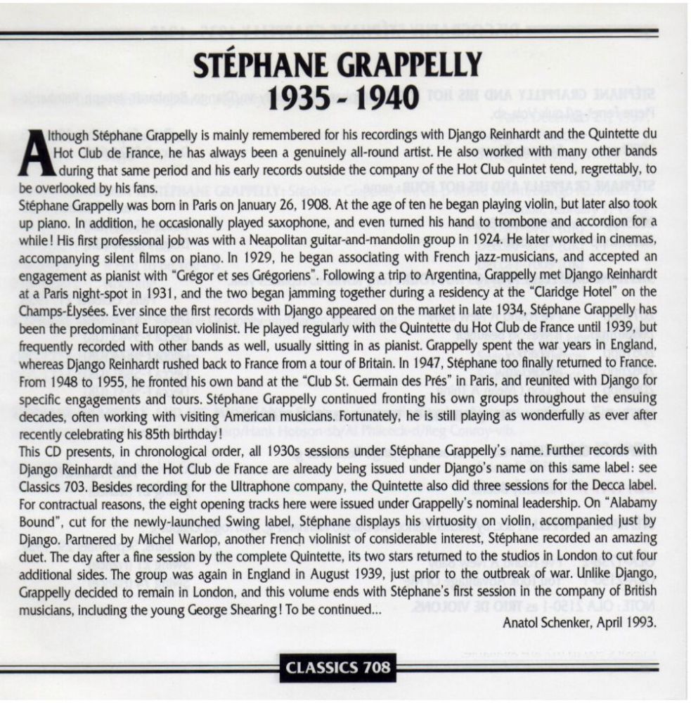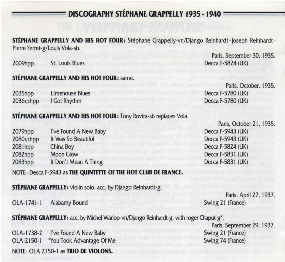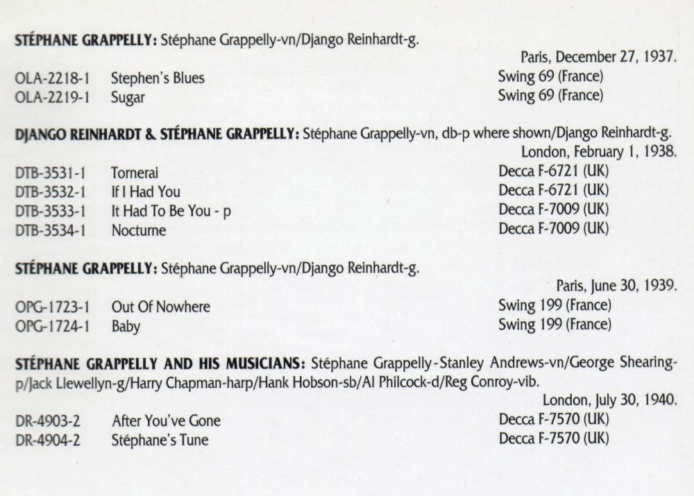 Grappelli gründete gemeinsam mit Reinhardt das Quintette du Hot Club de France, sie nahmen gemeinsam zahlreiche Schallplatten bis 1939 auf, u.a. für das Label Swing, und feierten Konzerterfolge. Als am 01. September 1939 der Zweite Weltkrieg ausbrach, befand sich ihre Band auf Konzerttournee in London. Reinhardt ging gleich nach Paris zurück, doch Grappelli blieb in England.
